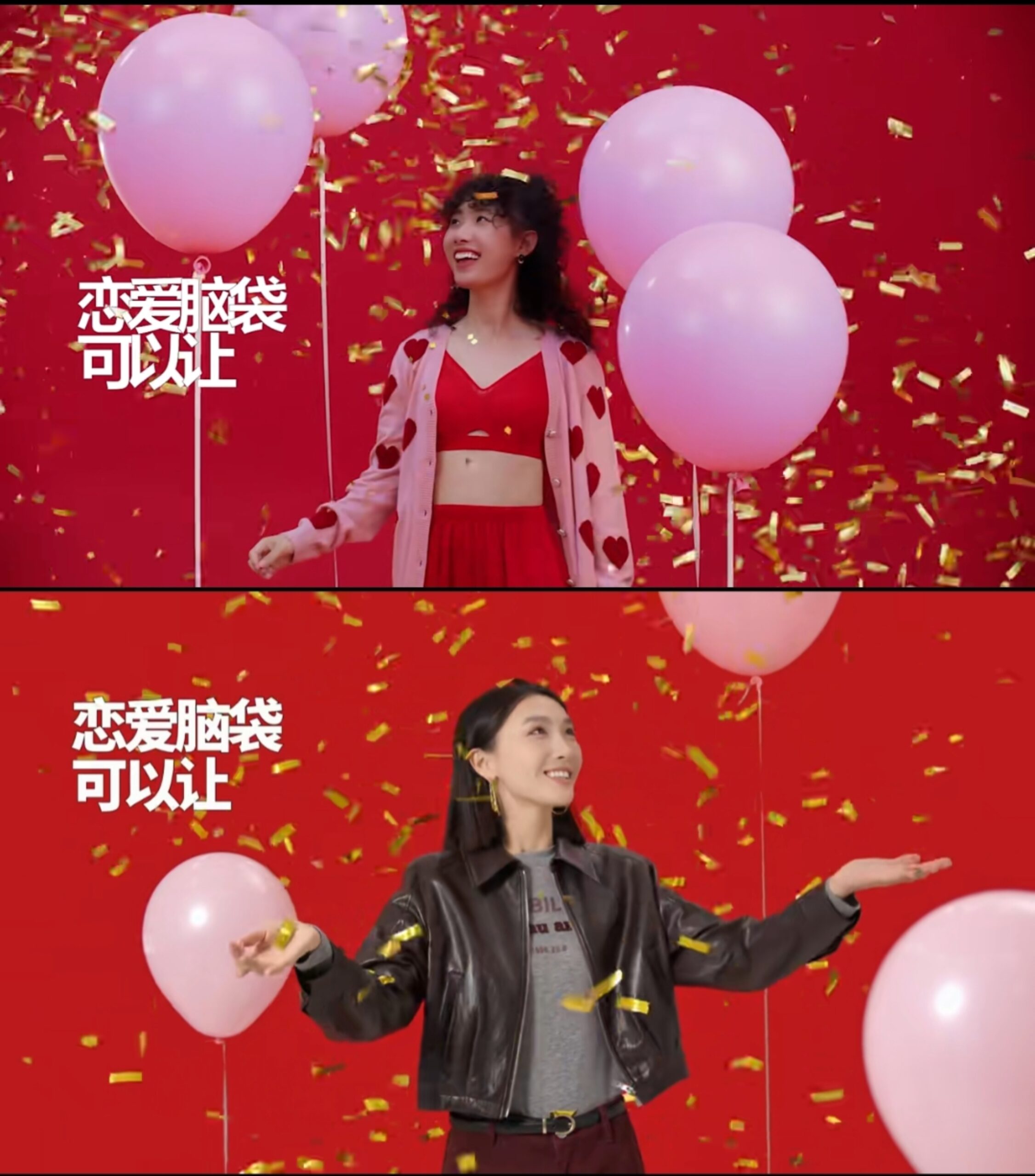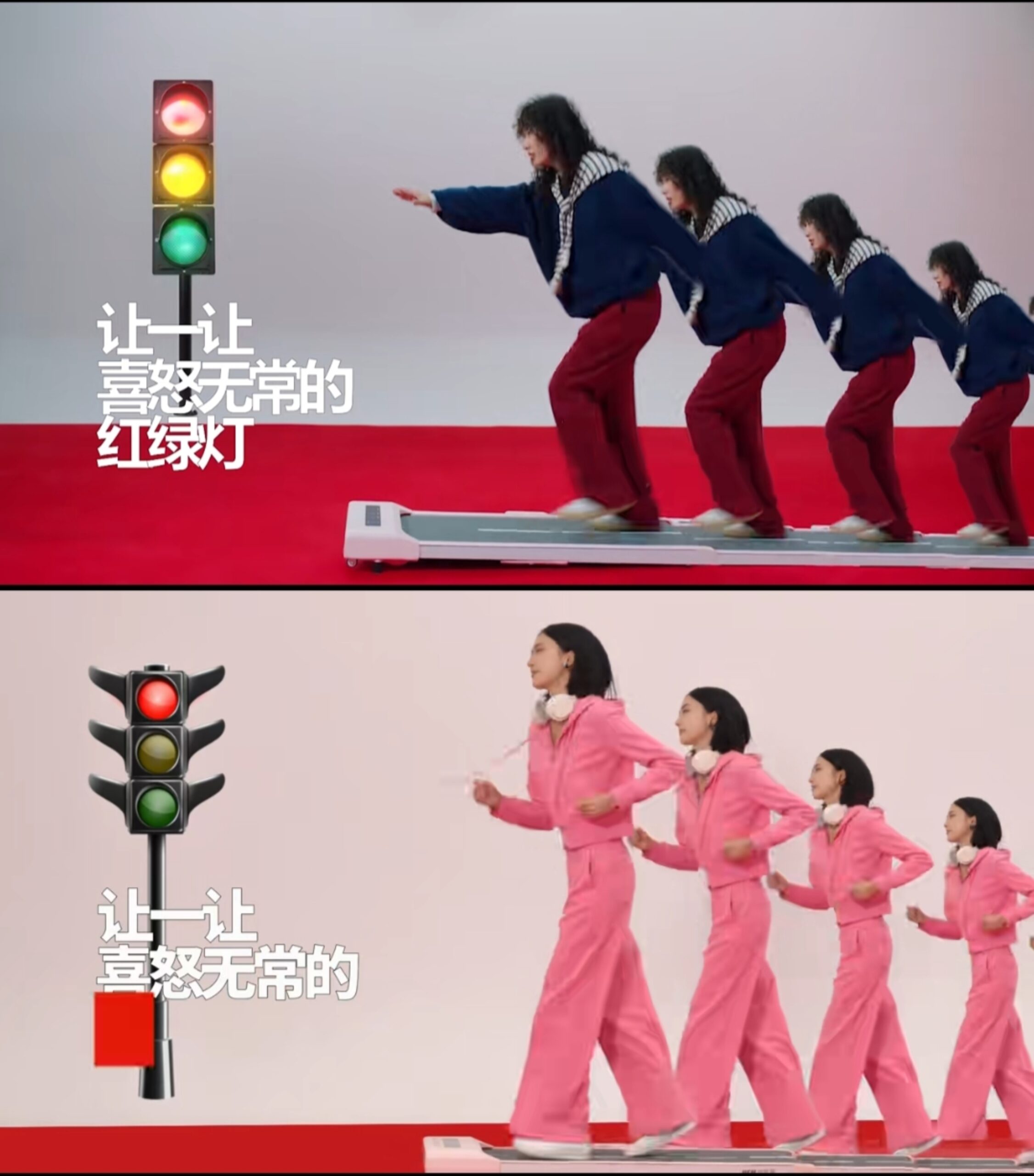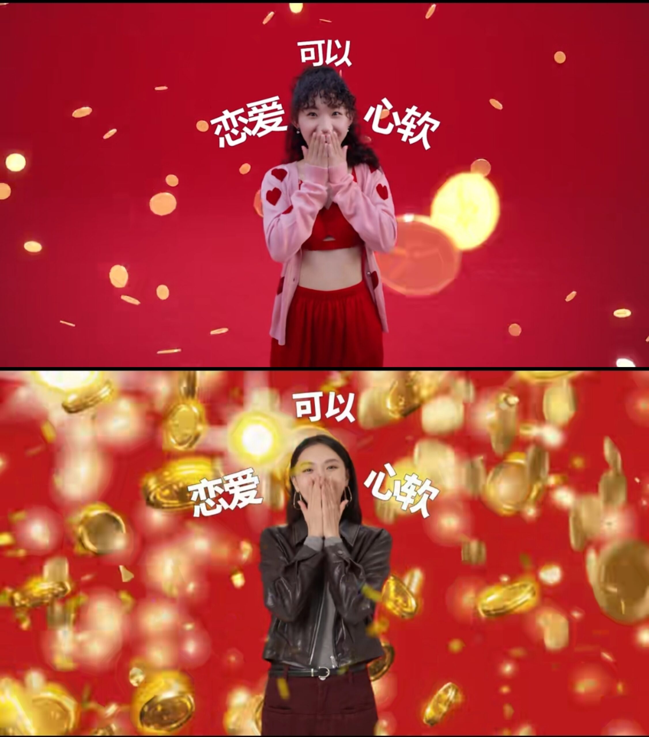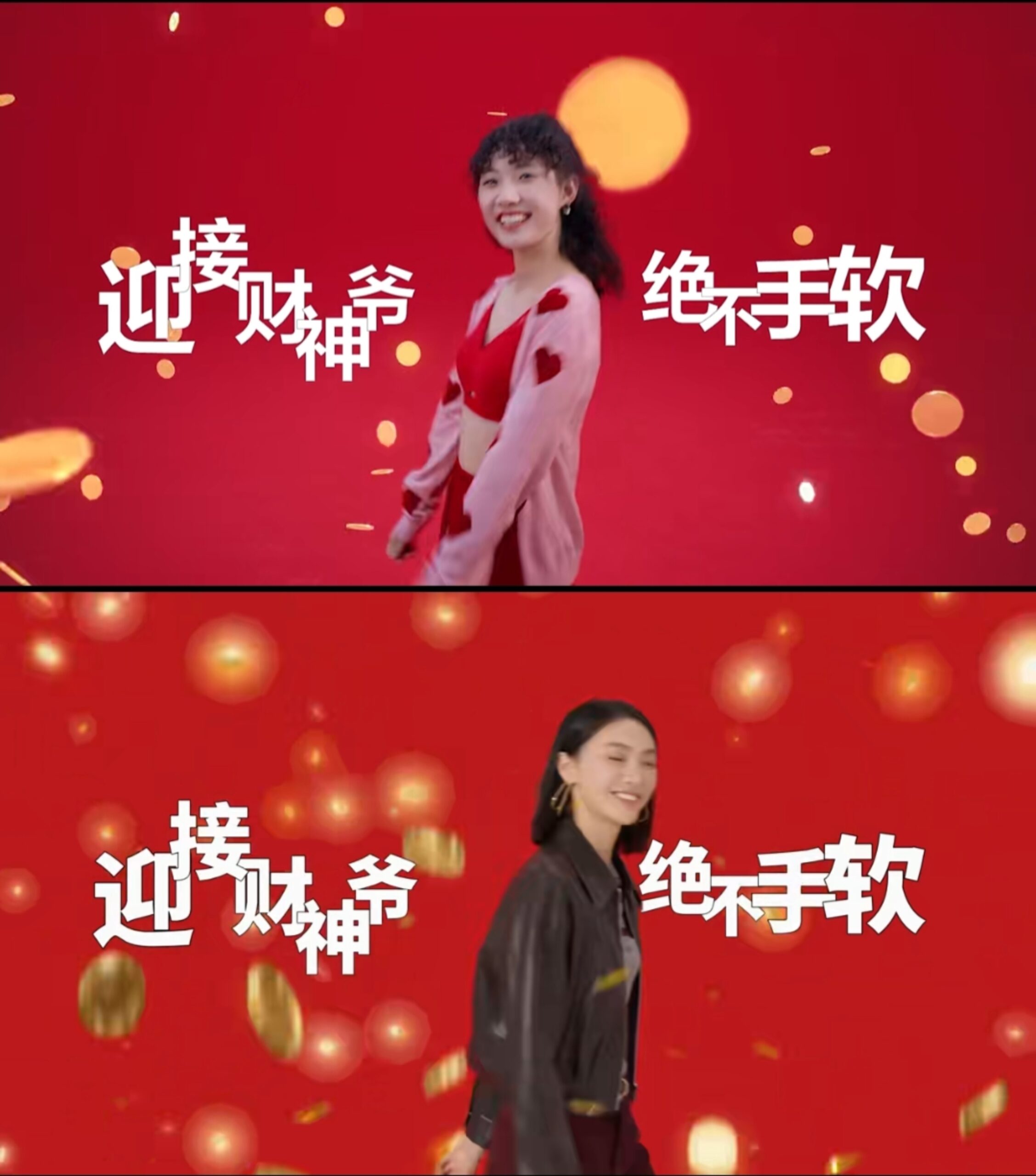 点开短片可以非常直观地感受到,除了模特人选的不同,两支视频在置景、运镜、特效等方面都非常雷同,甚至“当红不让”的核心文案也一字未改。