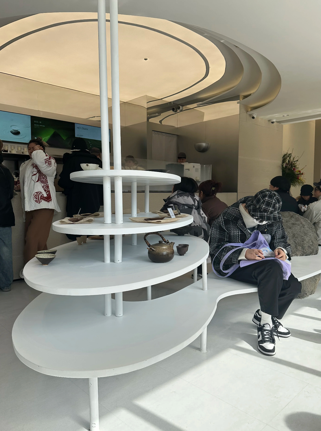 首先是不约而同的“大店策略”。奈雪曾以超200平方米的面积落地大阪,水吧天花板在灯光照射下可呈现出雪片落下的视觉效果;而喜茶大阪首店占地150平方米,以“枯山茶会”为主题,打造静谧的茶禅空间。