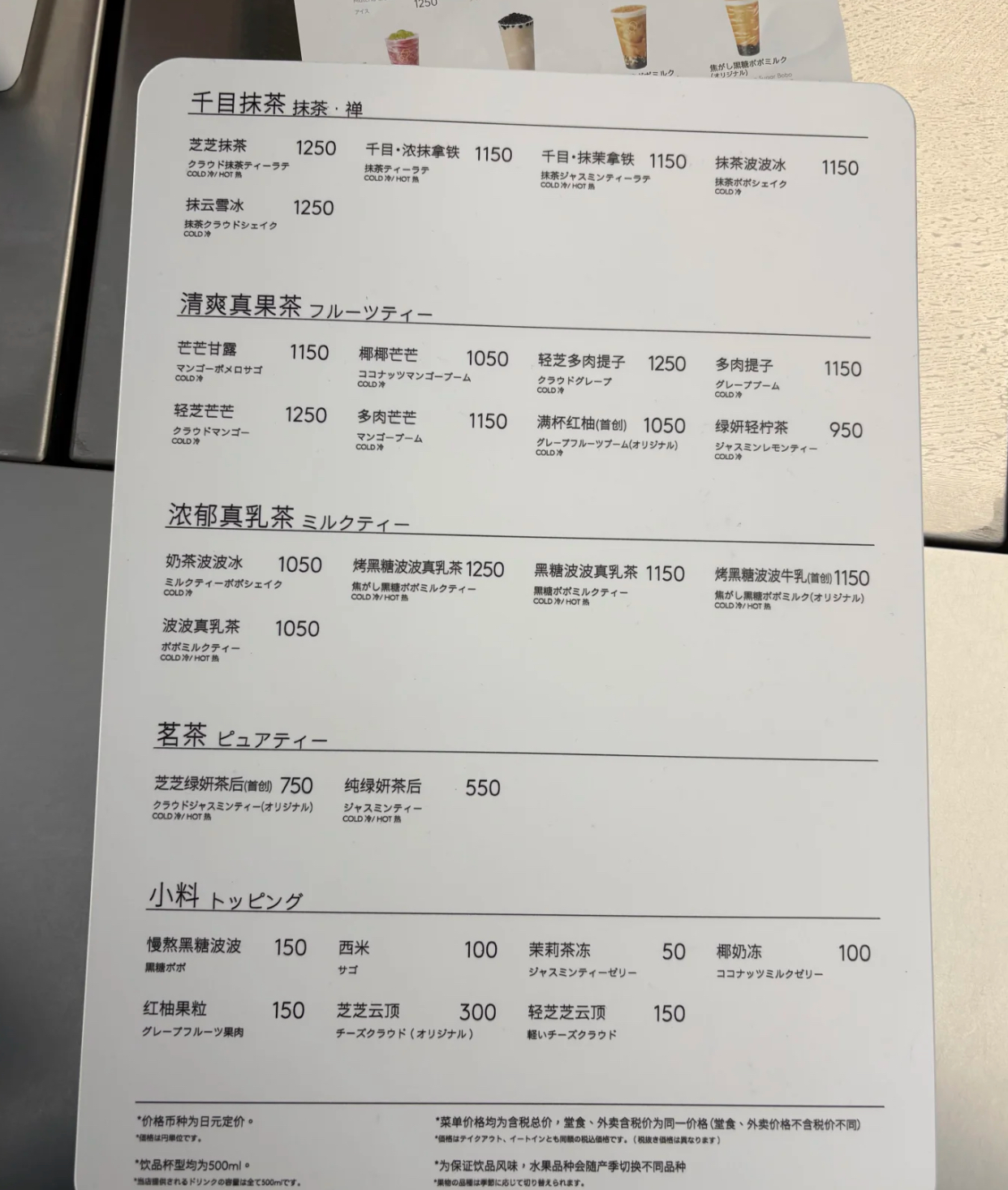 其次以果茶为主的饮品品类。据喜茶大阪店菜单,喜茶日本首店提供了多款经典产品,包括千目抹茶系列、真果茶系列、牛乳和绿妍茶系列等。
