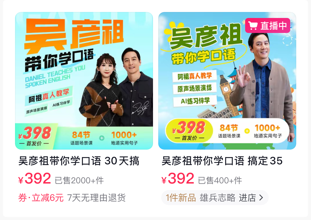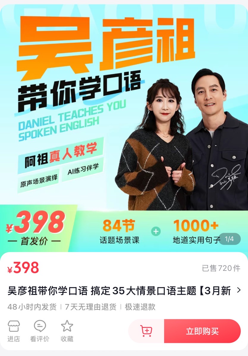 近日,吴彦祖在抖音等平台开设”吴彦祖教英语”账号,和高途APP合作推出的英语课程在多个抖音账号下挂车售卖,5天的销售额累计超过500万。