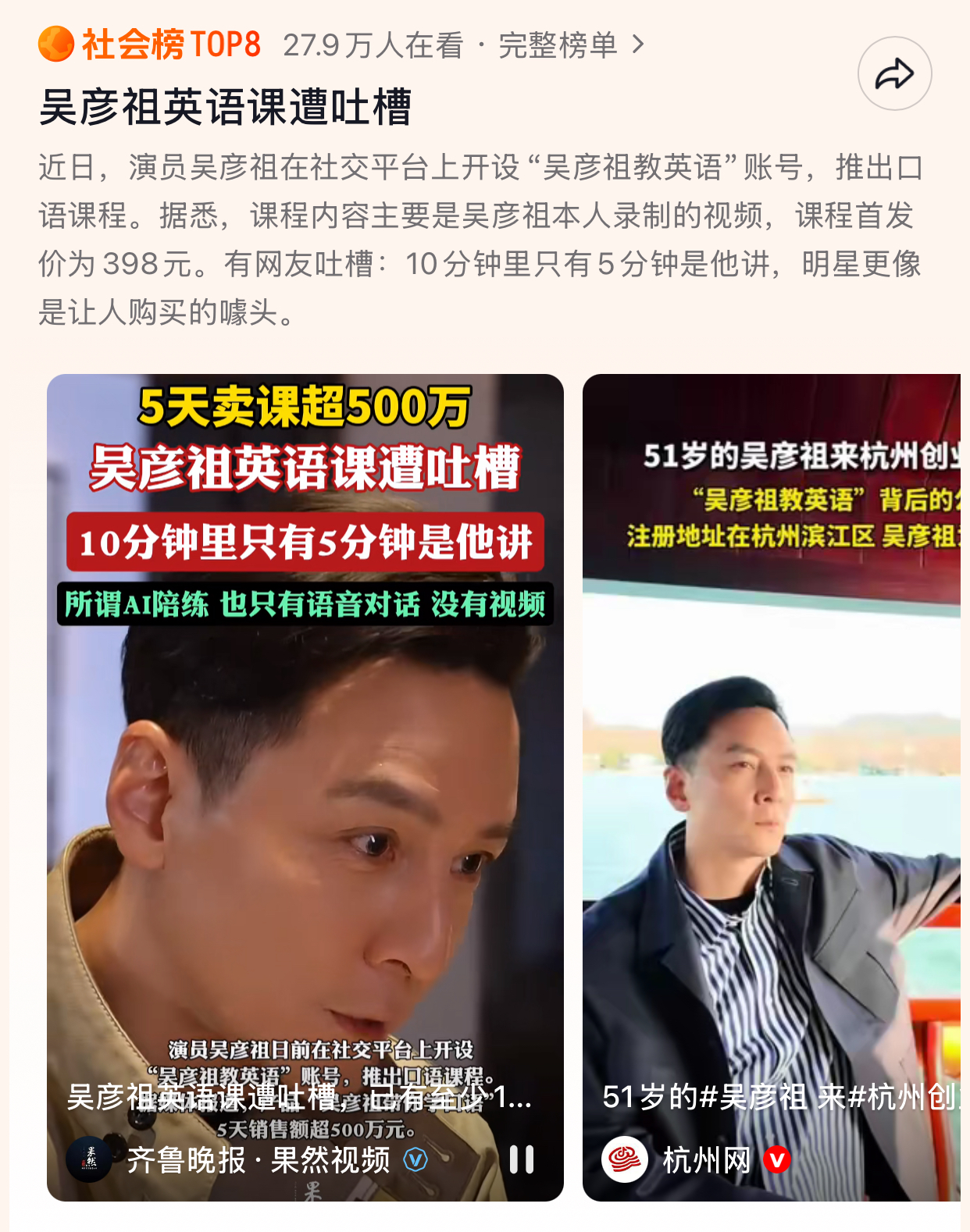与之形成鲜明对比的是, #吴彦祖英语课遭受吐槽# 也登上抖音热搜,用户指出实际教学视频中明星出镜占比不足50%,所谓的AI英语对话也仅以语音形式呈现,缺乏视频互动。