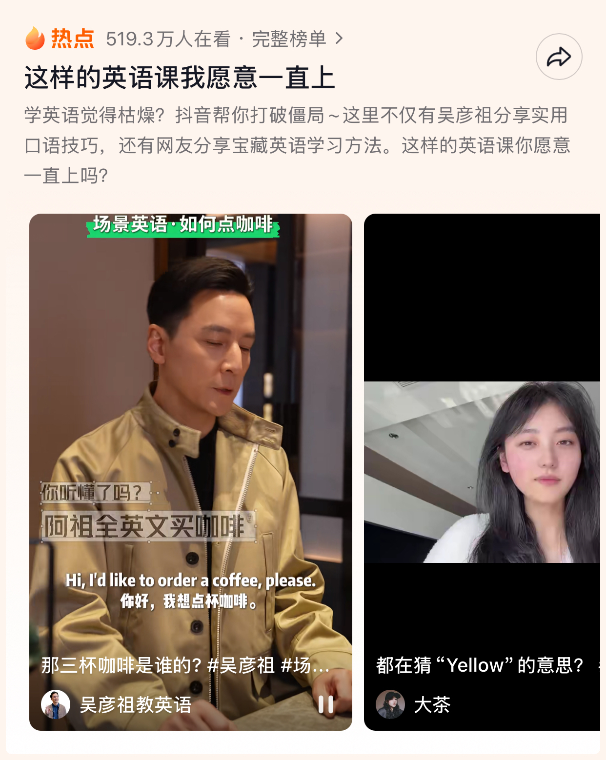 但市场反馈呈现两极分化:一方面,抖音热搜 #这样的英语课我愿意一直上# 话题下,首推视频吴彦祖示范咖啡点单用语,巧妙嵌入”民间吴彦祖”的网络梗,广受欢迎。