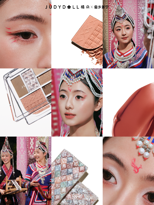 2025年4月,橘朵正式启动全新公益计划「让美被看见」,首站携手浙江省丽水市景宁畲族自治县,推出“橘朵七色×畲乡景宁 美的传送带”公益联名彩妆系列。该系列以橘朵经典热卖产品“七色玩趣眼影盘”为载体,以畲族彩带纹样为设计灵感,盘面采用非遗彩带编织压纹工艺,致敬畲族人民一针一线的匠心巧思。