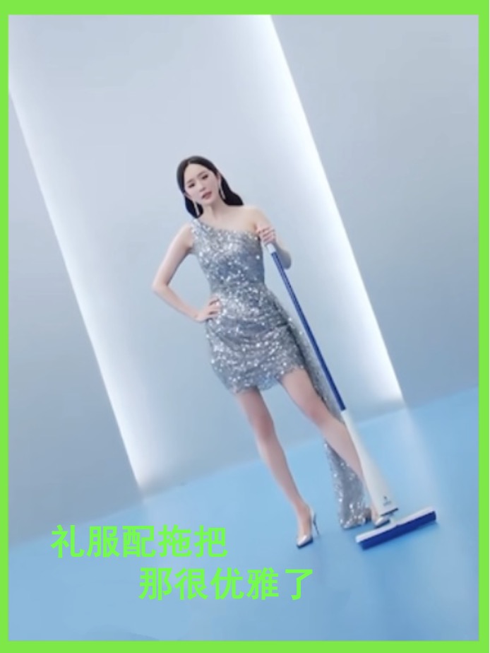 ——终于不是那种任劳任怨、解脱妈妈的广告了,礼服配上拖把,呈现出“不轻松我就不干了”的戏剧感。将家务工具与时尚大女主形象放在一起,完全跳脱出了传统家居广告围绕家务场景、家庭主妇展开的叙事。