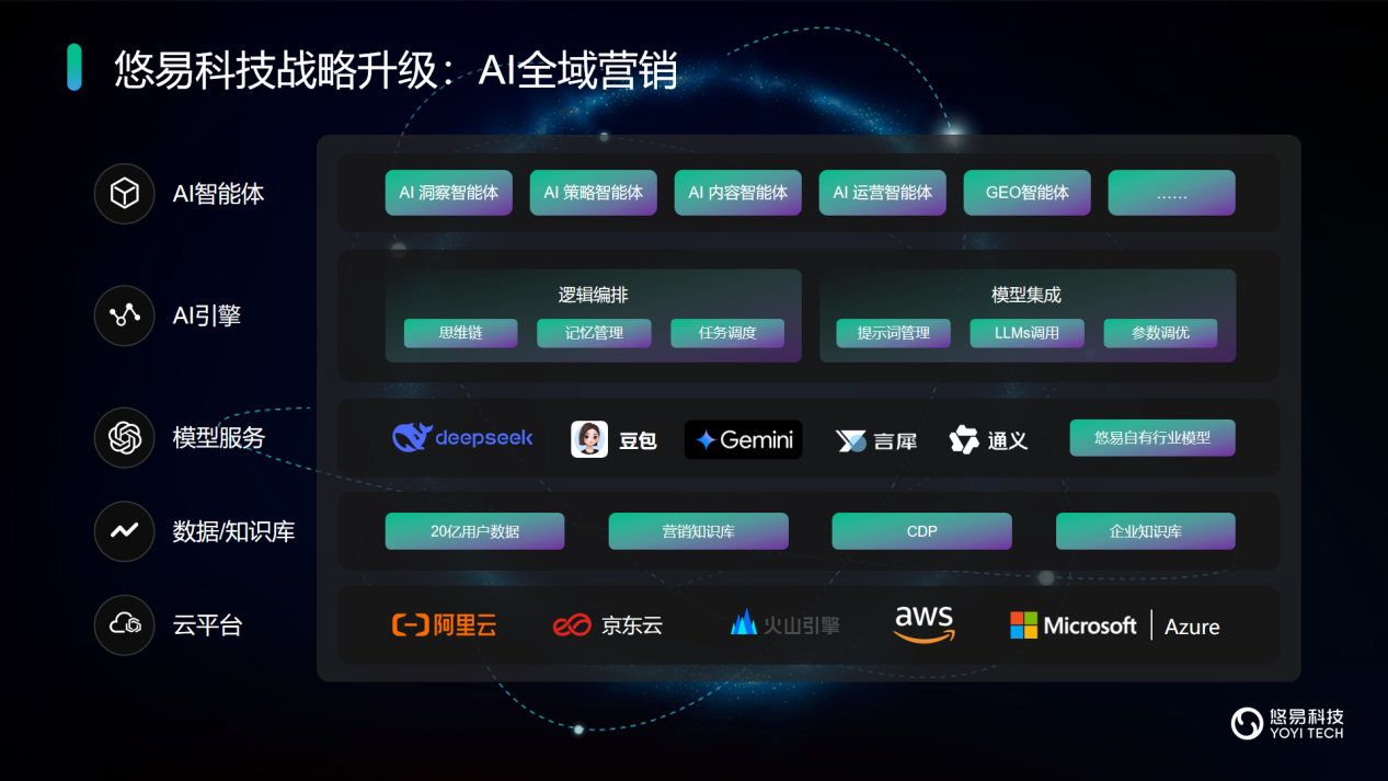 组织与业务的深度协同:为支撑战略落地,悠易科技同步完成组织架构革新,整合业务中台与产研团队(Tech & Delivery Center),加强AI大模型训练团队,实现技术研发与业务场景的深度耦合。CEO周文彪强调:“此次升级不是简单的标签更换,而是从技术架构、组织能力到服务模式的全面重构。”
