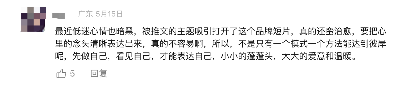 社交媒体上,有不少用户被广告片的洞察所感动。大家都曾因为各种外在因素陷入自我封闭,透过小女孩悠悠的经历,我们看到了自己;“不是只有一个模式一个方法能达到彼岸呢,先做自己,看见自己,才能表达自己”,用户在视频下方的留言如是。