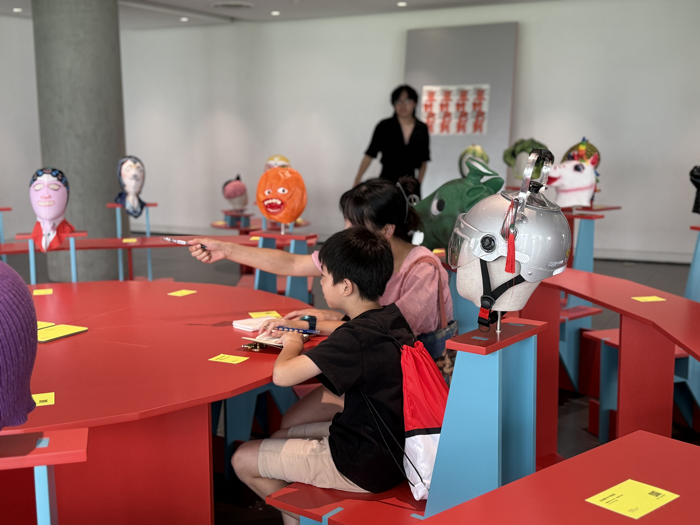 小朋友在“丑东西艺术策展”展区挑选了自己喜欢的丑头套互动。