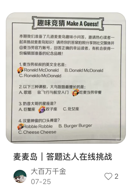 在《为什么品牌都渴望回归线下?》一文中,胖鲸曾剖析,社群的最终目标,是为了培养终身用户。这在麦当劳身上得到了印证,麦麦岛以及麦当劳策划的各类品牌创意活动,其实都在巩固和扩大自己的终身用户。