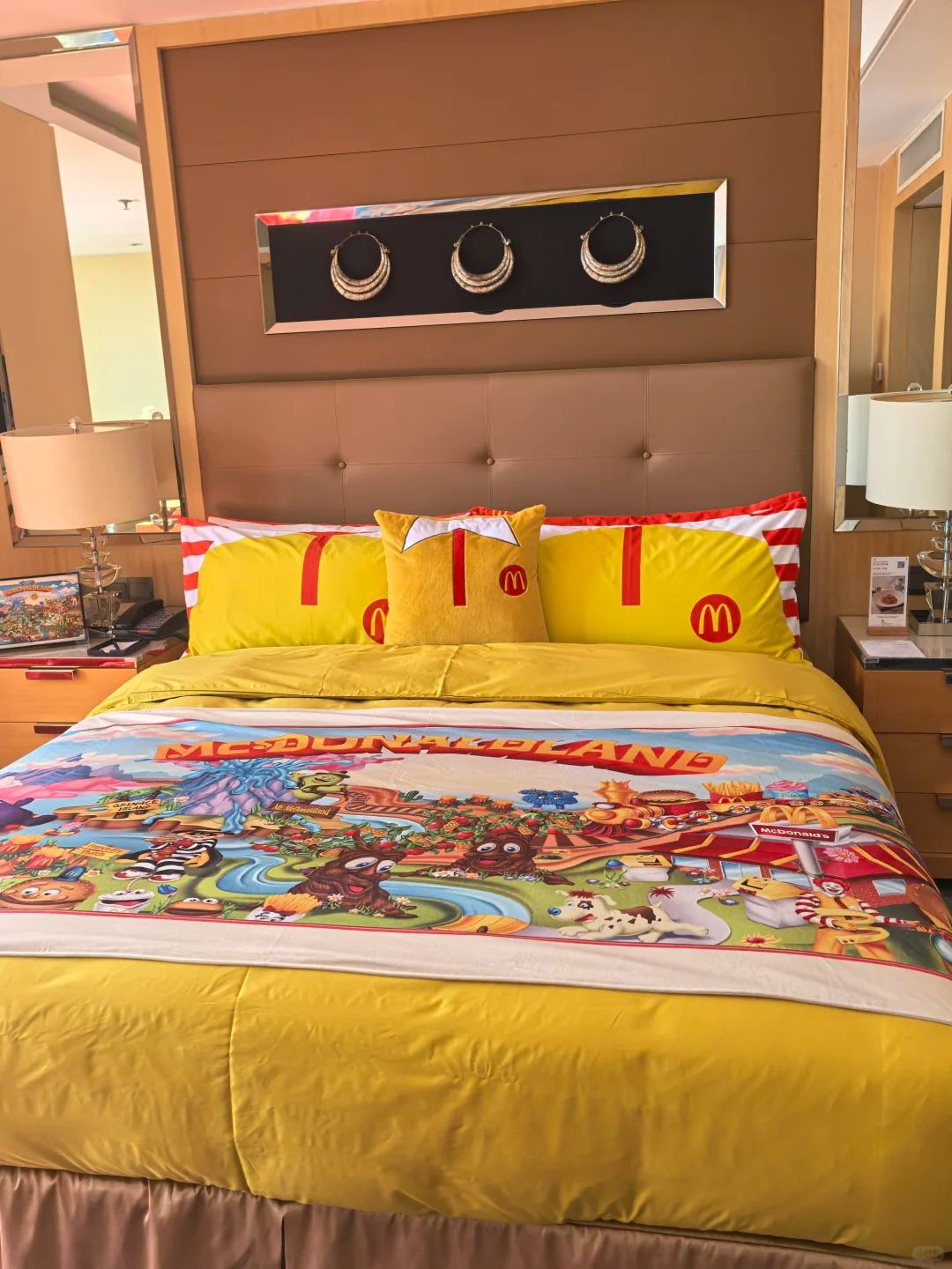 突破餐饮边界,将“麦麦岛”植入住宿、出行场景。洞察到夏日结伴出行游玩的需求激增,麦当劳联名万豪旅享家推出小福主题客房,主题浴袍、定制拖鞋,玩心开溜补给包将旅途的惊喜加满;还与滴滴合作主题车辆,出行路上延续“假日心情”,让麦当劳从一个用餐选择进阶为一种乐趣生活方式符号。谁能拒绝色彩明艳、自带欢乐“badabababa ”BGM的痛房、痛车、痛鞋呢?