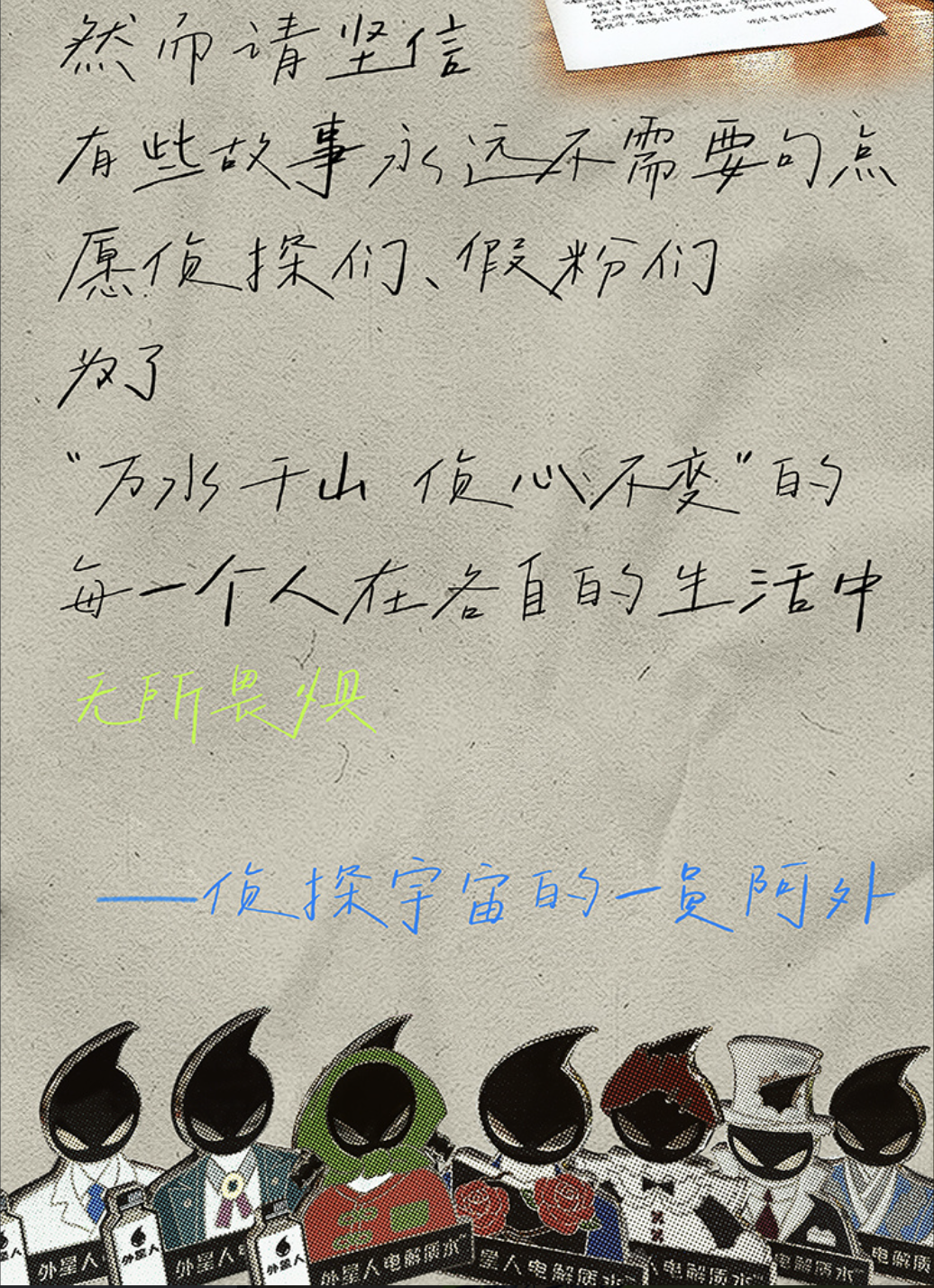 “老舅水”出圈,形成了广泛的认知基础,成为外星人电解质水打造联名款的动力来源。“我们非常感谢这些愿意在节目外还主动传播品牌的粉丝们,所以有了十周年的联名产品「外星人老舅水」和这封给大侦探粉丝们的信,可以说这封信就是我们做这个项目的初衷。”
