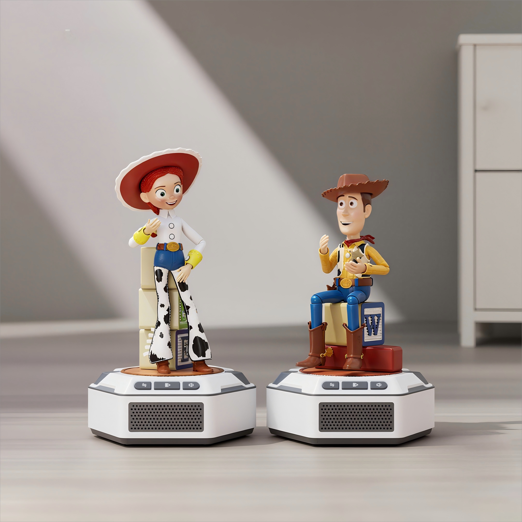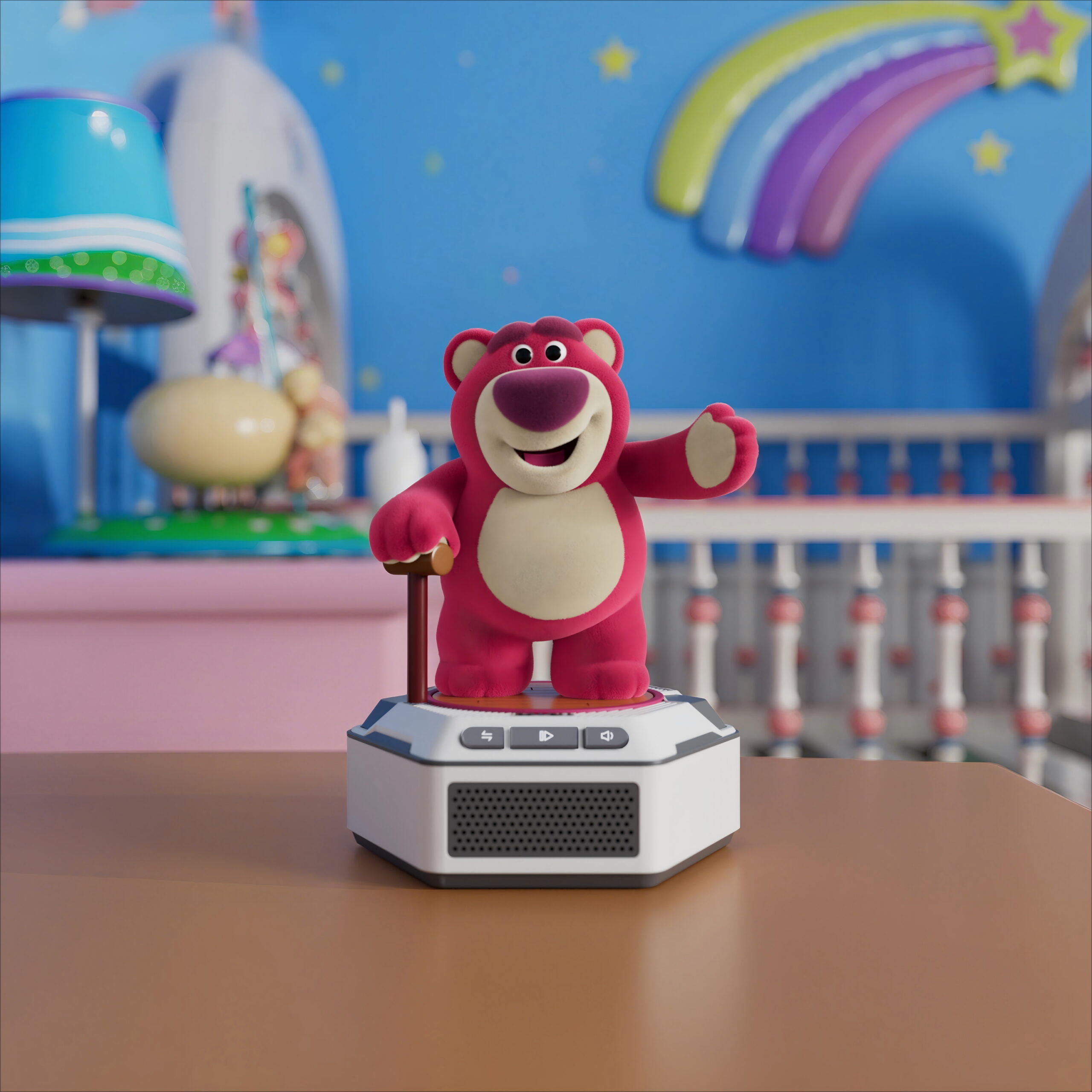 胖鲸注意到,今年展出的授权商新品中,有一款《玩具总动员》形象的授权产品格外瞩目,吸引了众多参会者围观——六个巴掌大小的 IP 公仔,在机械底座上扭动身姿,不时“挤眉弄眼”,用原声台词复刻着电影名场面,活脱脱的“显眼包”。区别于传统玩具,这款来自消费级机器人厂商「ROBOSEN乐森机器人」的智能化新品,呈现出更强的交互性和内容承载能力。