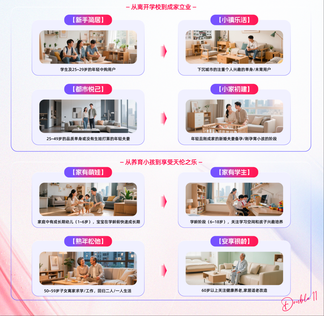 比如,针对处于单身阶段的“新手简居”和“小镇乐活”提供高性价比、多功能的入门级产品;服务“都市悦己”和“小家初建”的年轻家庭,侧重推荐设计感、品质感和场景化的套装产品;围绕“家有萌娃”和“家有学生”的成熟家庭,安全、环保、强收纳等功能性产品更具优势;为“熟龄松弛”和“安享银龄”的老年人群提供舒适、健康、适老化改造的产品和服务。