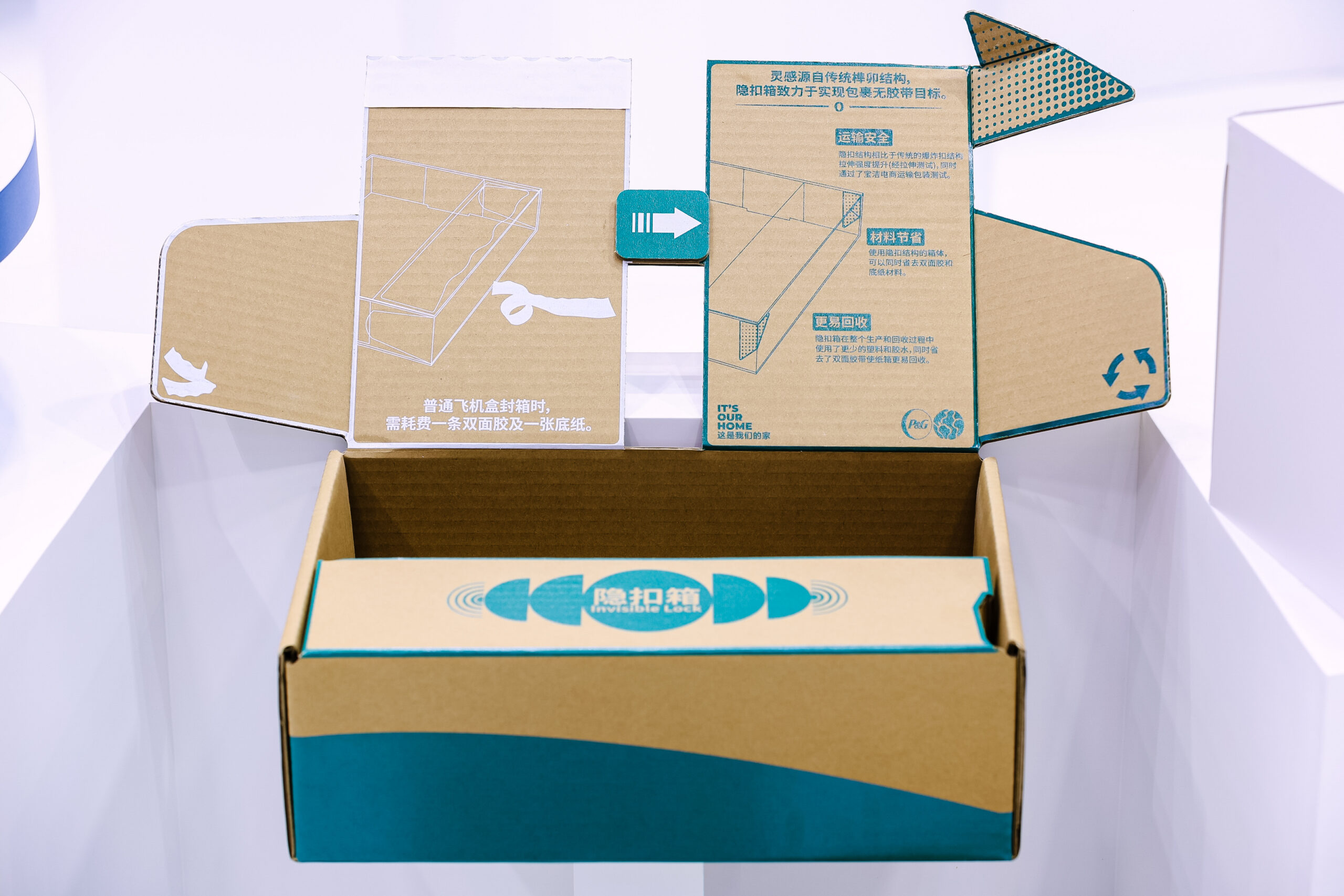 在包装创新方面,今年在进博会现场全球首发隐扣箱,灵感源自传统榫卯结构,减少了胶带的使用,提升了纸箱回收的便利性。同时即展®️可重复使用展示箱二代也正式亮相,其在整个生命周期中极大程度减少材料消耗和污染,箱体对比一代使用塑料更少,使用场景更加灵活多样,真正实现高效陈列与环境友好。