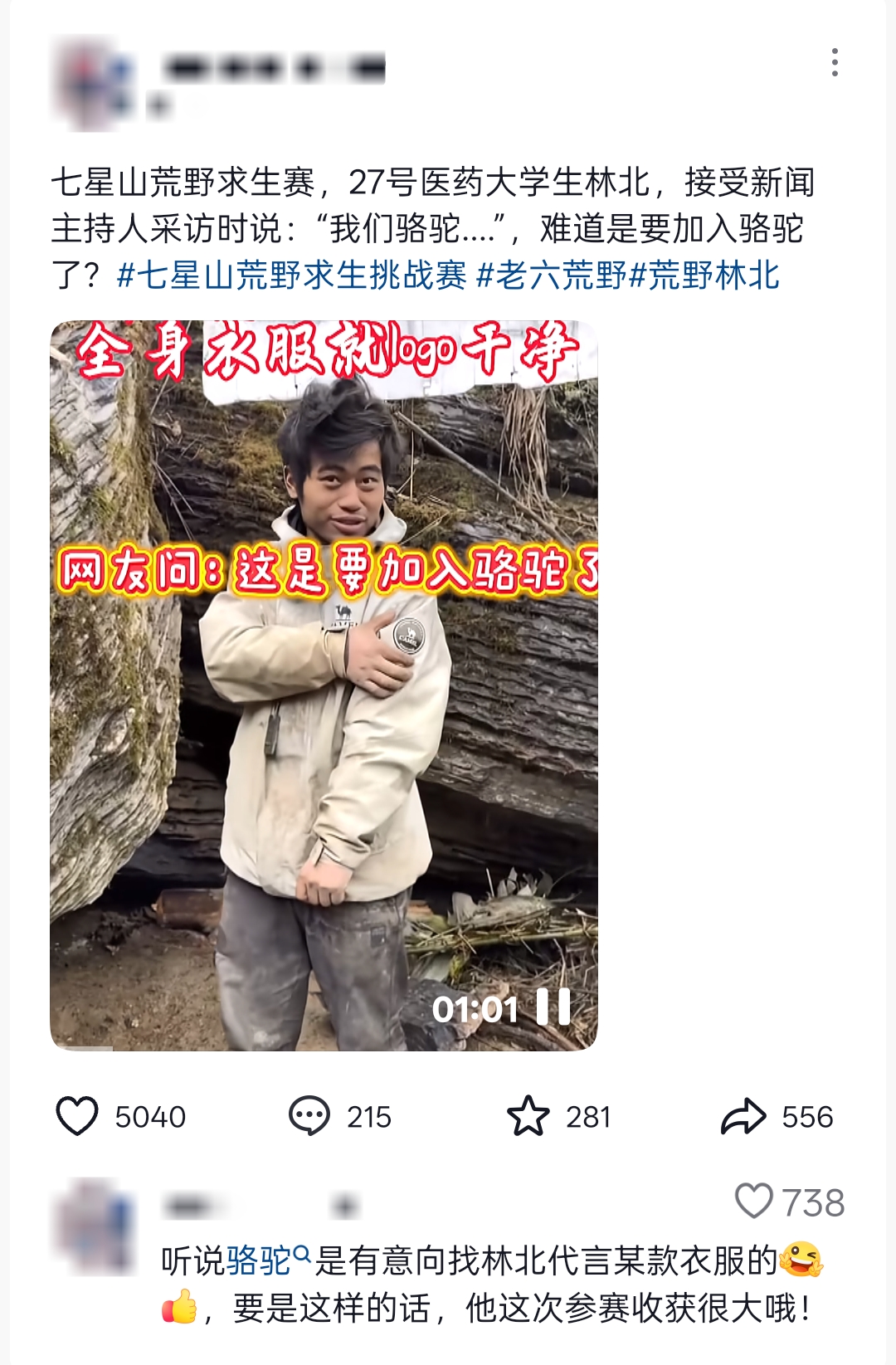 而另一方面,骆驼也意外成为了用户与选手互动的媒介。比如,当林北的裤子意外破损时,评论区就涌现出大量“@骆驼官方,快来看看你家选手!”的互动。
