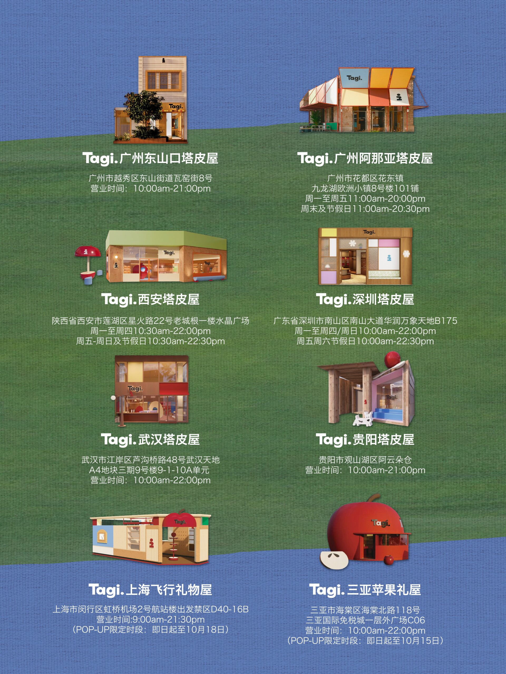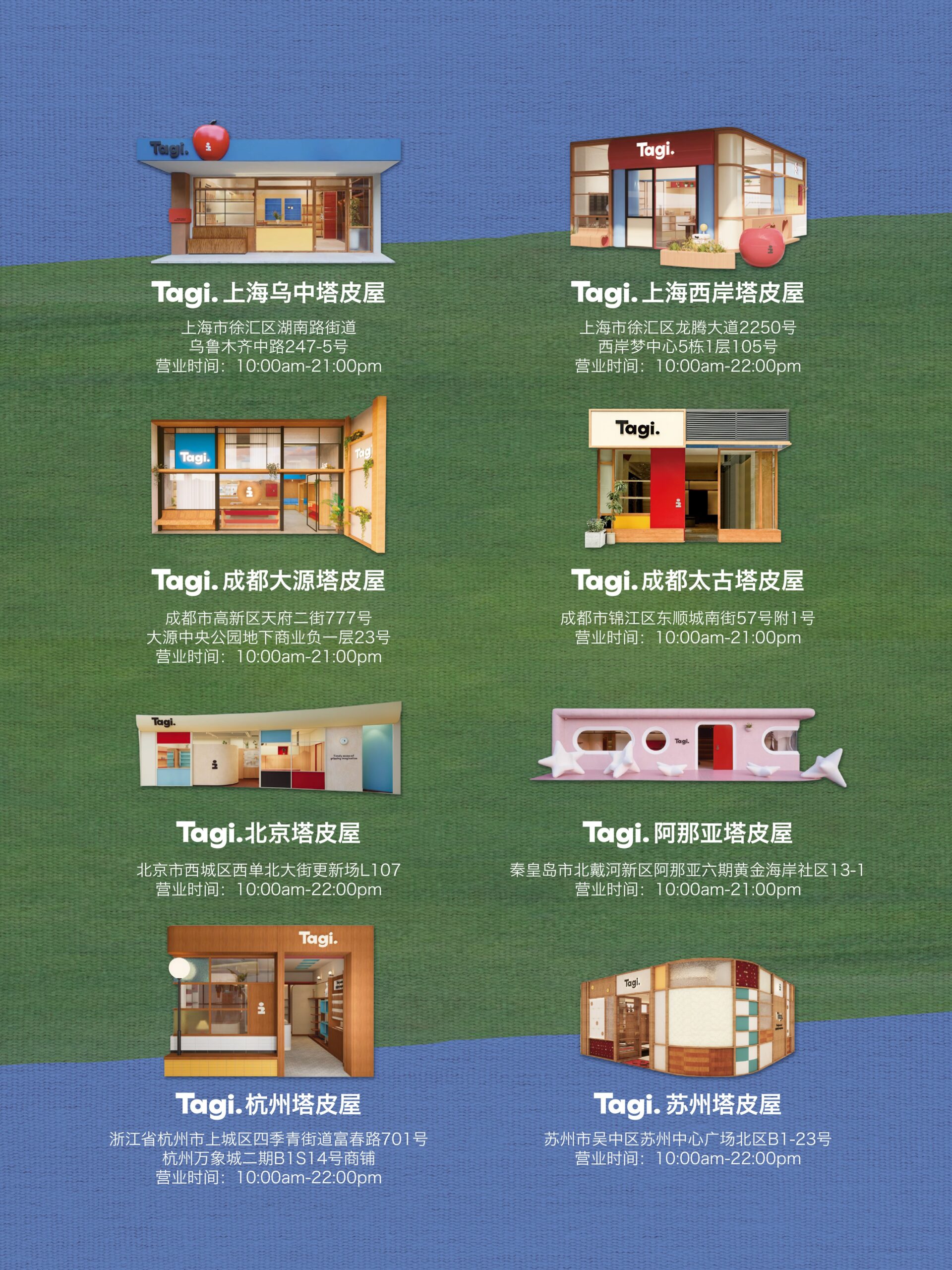 自在上海乌鲁木齐中路开出第一家线下门店后,Tagi. 已经在上海、北京、成都、武汉等多座城市开出了十余家直营门店。遵循着策展式零售逻辑,Tagi. 每一个门店都坚持“一店一设计”的原则,将门店本身打造成一个大型的、可体验、可传播的内容产品,称之为“塔皮屋”,通过重资产投入,为品牌创造出场景体验感的溢价,同时,差异化的门店设计也能为受众带来持续的新鲜感。