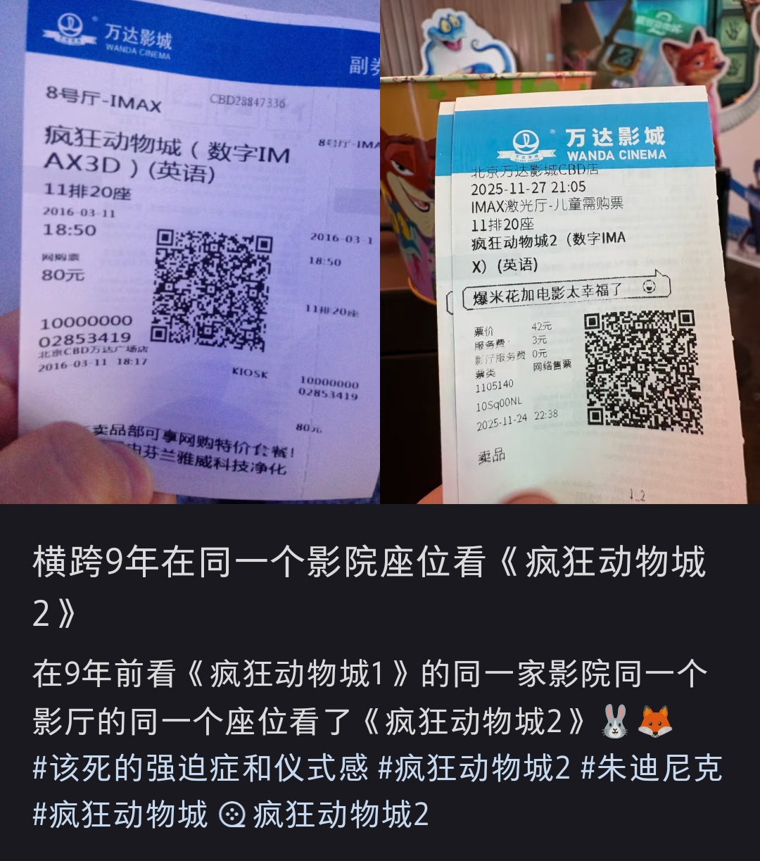 有人在小红书晒出两张电影票——横跨 9 年、同一家影院、同一个座位看《疯狂动物城》。时间能让少年长大成人,但朱迪和尼克,好像从未真正离开。