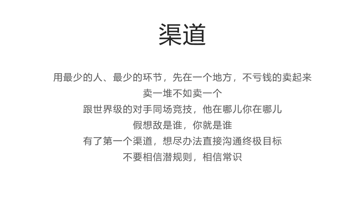 如果表达一个观点没有先描述环境,那么这个观点是相对的。我想讲的所有的信息,都是基于我想要做一个“没有库存的”消费品品牌——用一个产品卖全世界所有的渠道为前提而做的思考。大家可以带着这样的环境描述来理解我的想法。