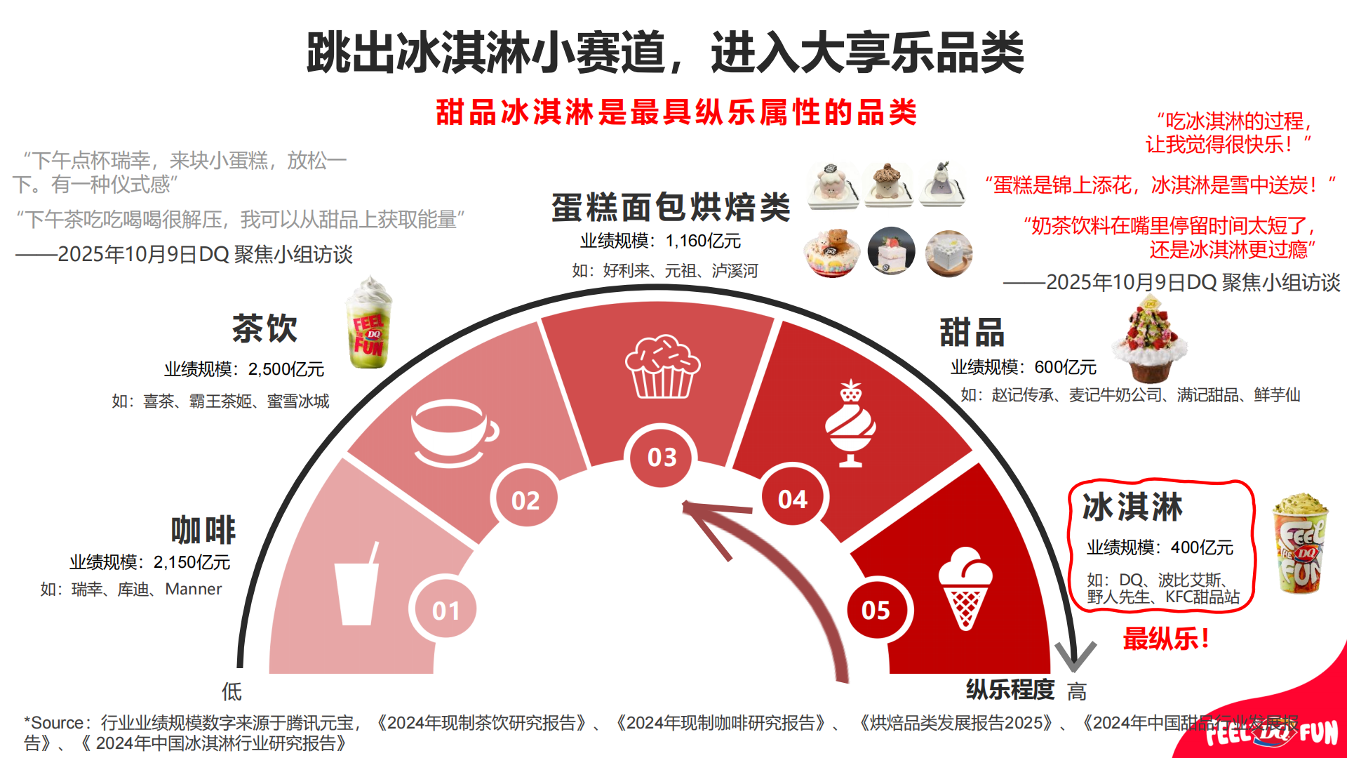 如果将咖啡、茶饮、蛋糕面包烘焙、甜品、冰淇淋放在同一个坐标里,咖啡茶饮代表的是更高频但纵乐属性更低的商品,而冰淇淋是极致的纵乐,消费频次相应地也没有那么高。最终体现在咖啡、茶饮的市场规模远超甜品、冰淇淋。