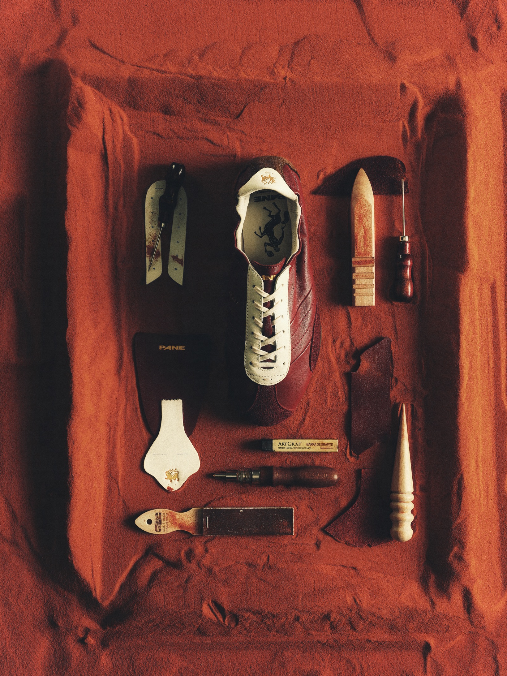 活动空间中同步呈现草药档案图集,系统梳理绿松灵、金暖酥、玫芝露、灵龙参、安辛檀等核心草本的来源与感官特质;另一侧的 PANE 工坊档案,则完整展示一双鞋履从手绘设计稿开始,经历皮料甄选、鞋楦调整、缝线裁切与抛光轮反复打磨的过程,呈现品牌在“风格与舒适”之间的持续探索。