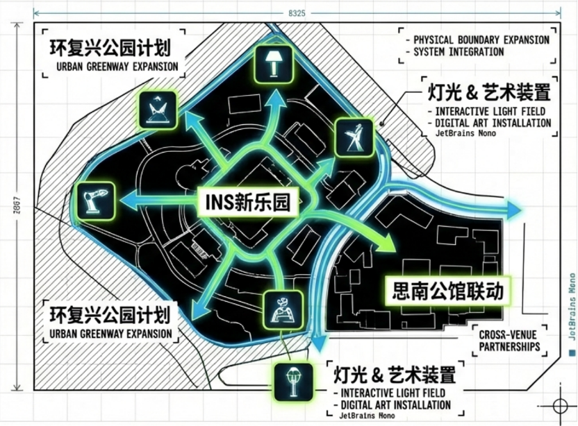 同时,空间也在持续拓展。随着“环复兴公园”计划的推进,INS 的运营范围将从主楼延伸至公园内的游乐设施、思南公馆历史街区,通过连贯的灯光、艺术与活动设计,逐步形成一个步行可达的乐园网络,在物理层面链接起城市空间与人的活动。