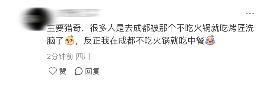 其实从五角场的拉票阵营可见一斑——学生群体。烤匠在成都的受众,与费大厨在长沙的受众是相似的,通过醒目的招牌和洗脑的广告,为品牌吸引了流动性大、消费习惯尚未定型的学生群体:他们未必长期生活在当地,但对当地的口味有自己的理解与偏好。而当品牌走到大城市,他们也倾向于在众多品牌中选择更能带给他们亲切感和确定性的品牌。