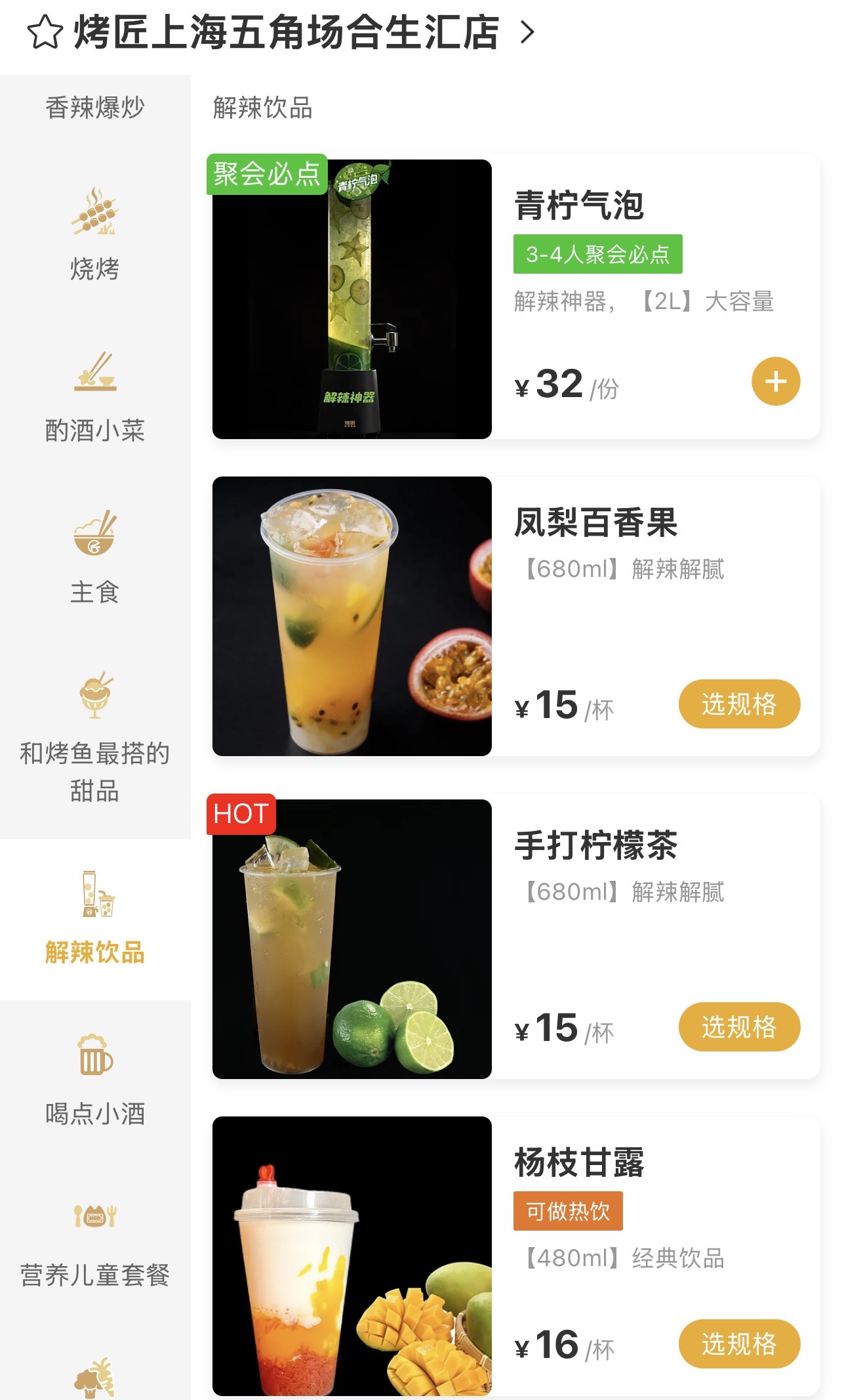 饮品和酒水也偏年轻化。例如,解辣神器“青柠气泡”,不仅在包装容器上做了定制化设计——长圆筒+氛围灯+出水阀,造型美观且取用方便,口感上也做到了酸甜平衡、风味厚重,并不输同类型的连锁茶饮品牌。酒水方面则提供了水果特调、煮啤酒、成都茶酒、手作米酒、梅子酒等作为选择,既彰显川渝特色,也为年轻人的聚会场景做了特别定制。
