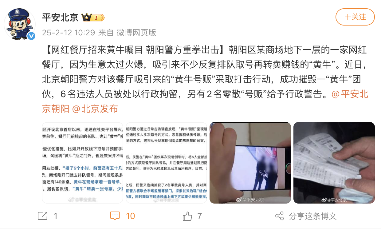 让烤匠闻名全国的一个契机是,2025 年 2 月,北京朝阳警方抓获 8 名倒卖餐号的“黄牛号贩”,事件经“平安北京”通报成为社会新闻,烤匠很快做出了回应,并借此公开了品牌的防黄牛措施。