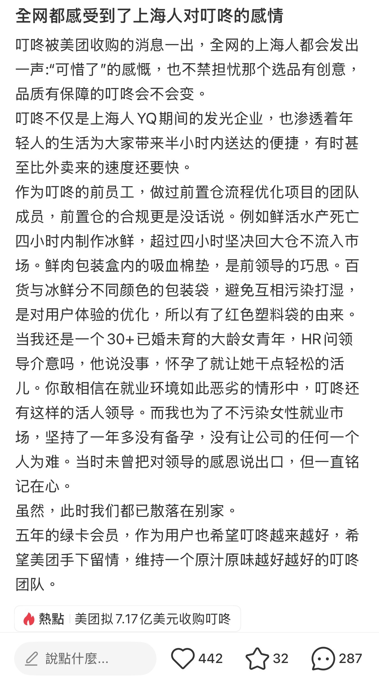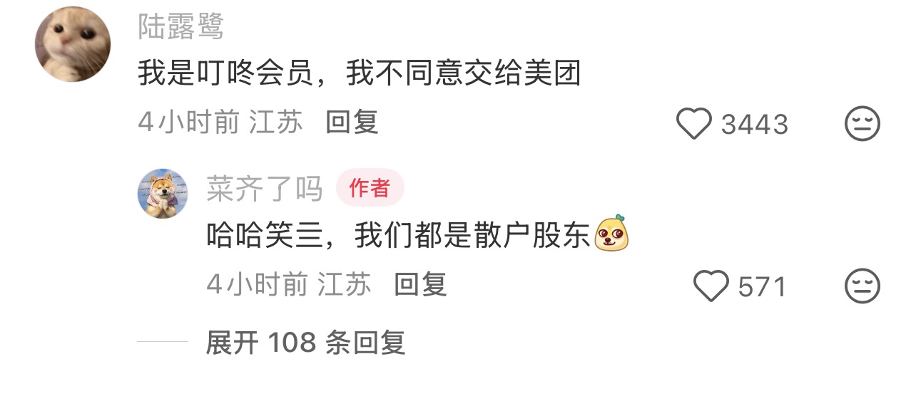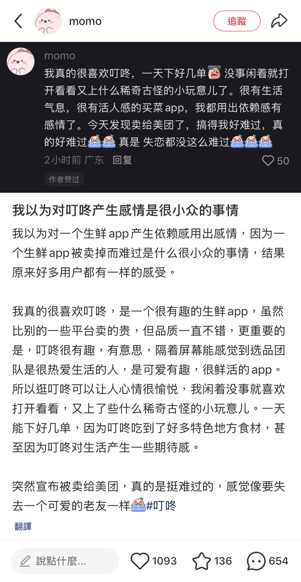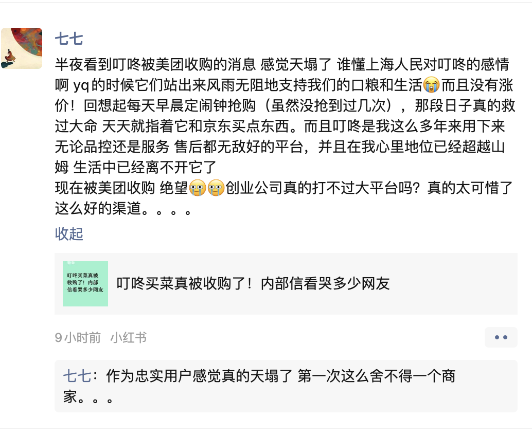 “我是叮咚会员,我不同意卖给美团”“叮咚被收购,这跟断崖式分手有什么区别”“有一种讨厌的公司收购了喜欢的公司的感觉”,类似的表达,在评论区反复出现。