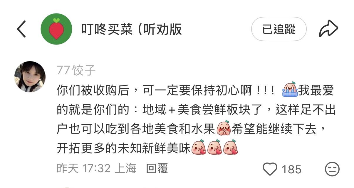 在叮咚买菜最新一条小红书内容下,一条高赞评论写道:“你们被收购后,一定要保持初心。”