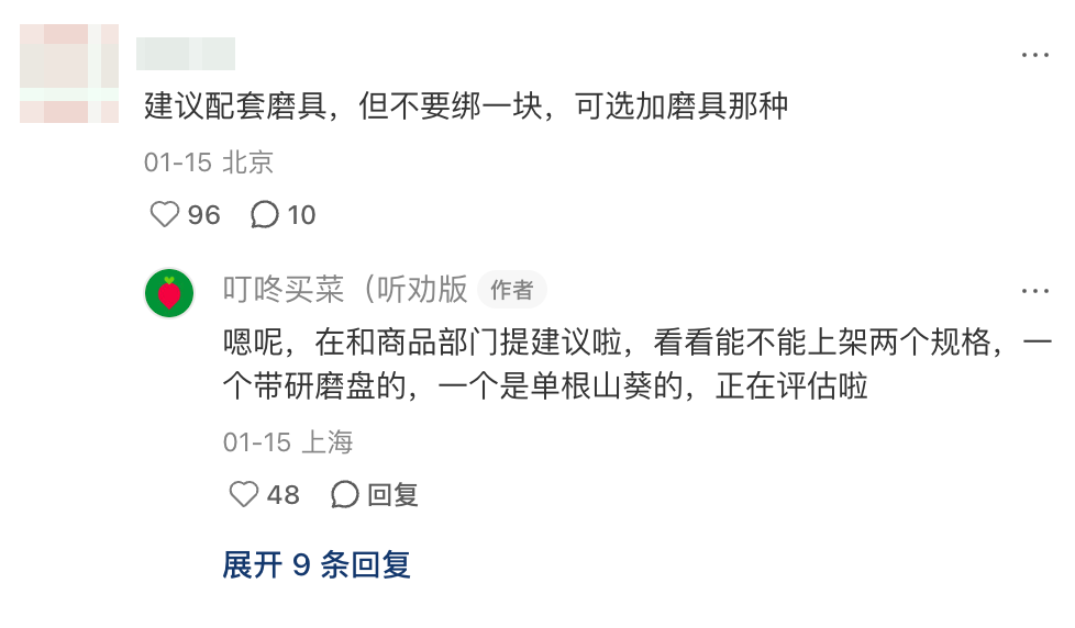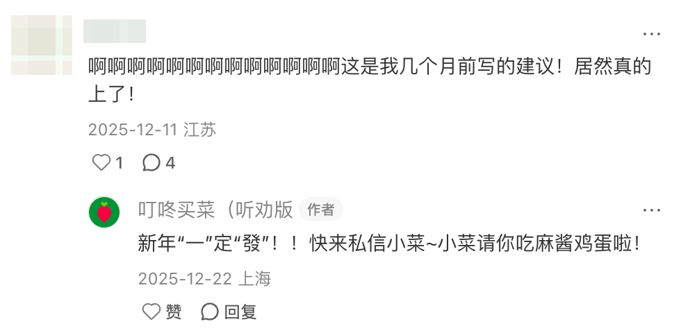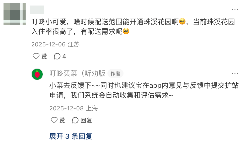 一直以来,叮咚买菜强调“与用户同行、为用户考虑”,在官方账号中也常常以亲切的方式与用户互动,包括回应用后反馈、个性化选品等。