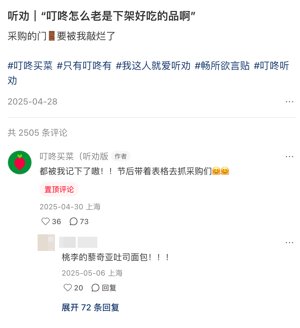 比如,在一条分享鹿肉的评论区中,一位用户提到想吃木薯,被官号评论之后,下一条帖子就是叮咚买菜上架木薯的消息。