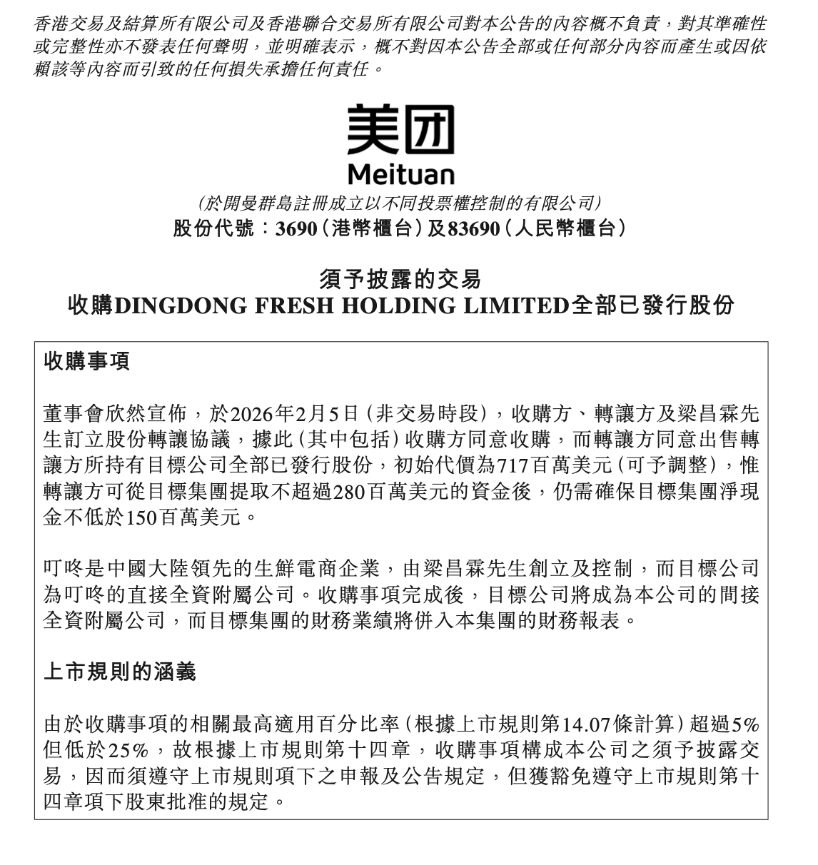 2026 年 2 月 5 日,美团在香港联交所发布公告,宣布以约 7.17 亿美元的初始对价,收购叮咚买菜中国业务全部股权(海外业务不在本次交易范围内)。