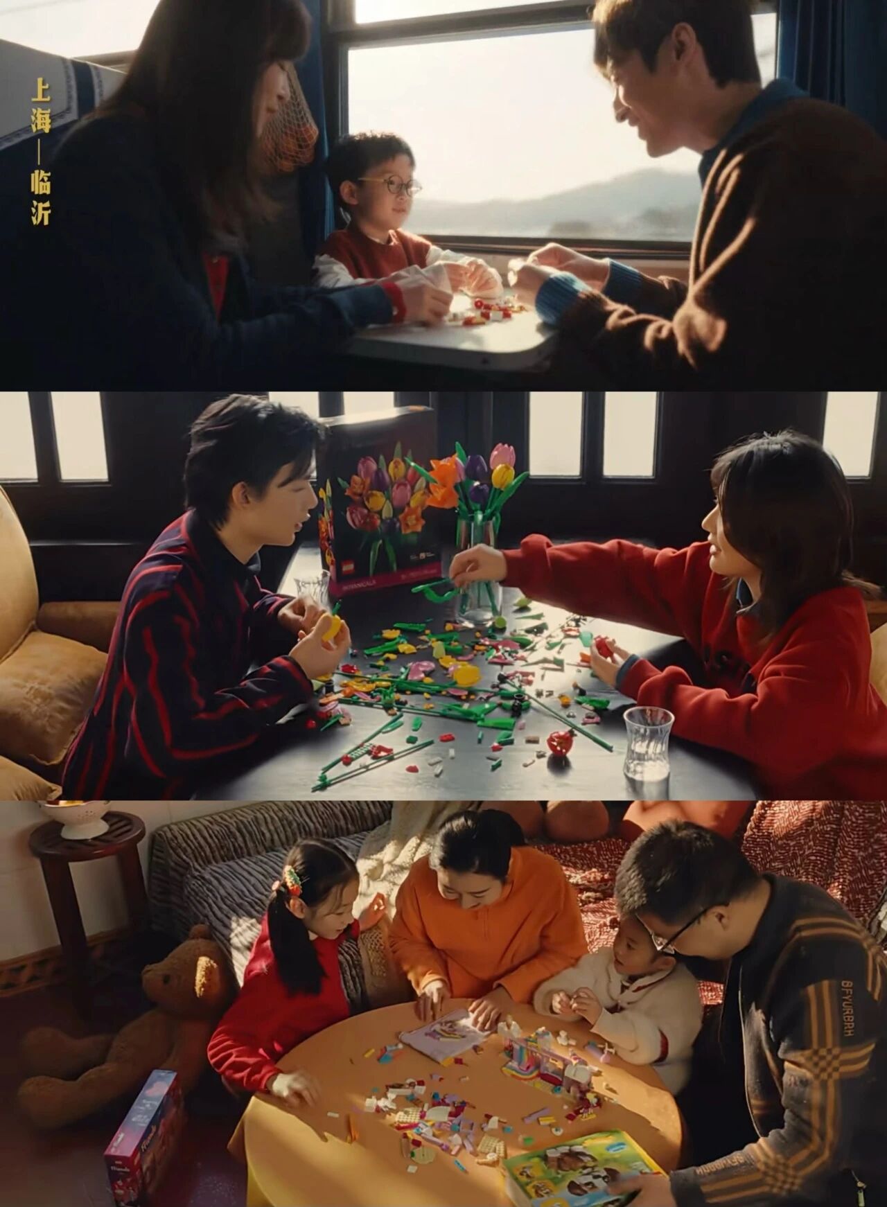 归乡列车上,面对孩子“怎么还不回家”的焦躁,UP 主 @啊吗粽一家选择乐高®积木作为枯燥的解药。乐高®积木颗粒倾倒在小桌板上,一家人围拢,手指专注于拼搭一座旋转木马,单调的车程变成亲子之间温馨的协作。