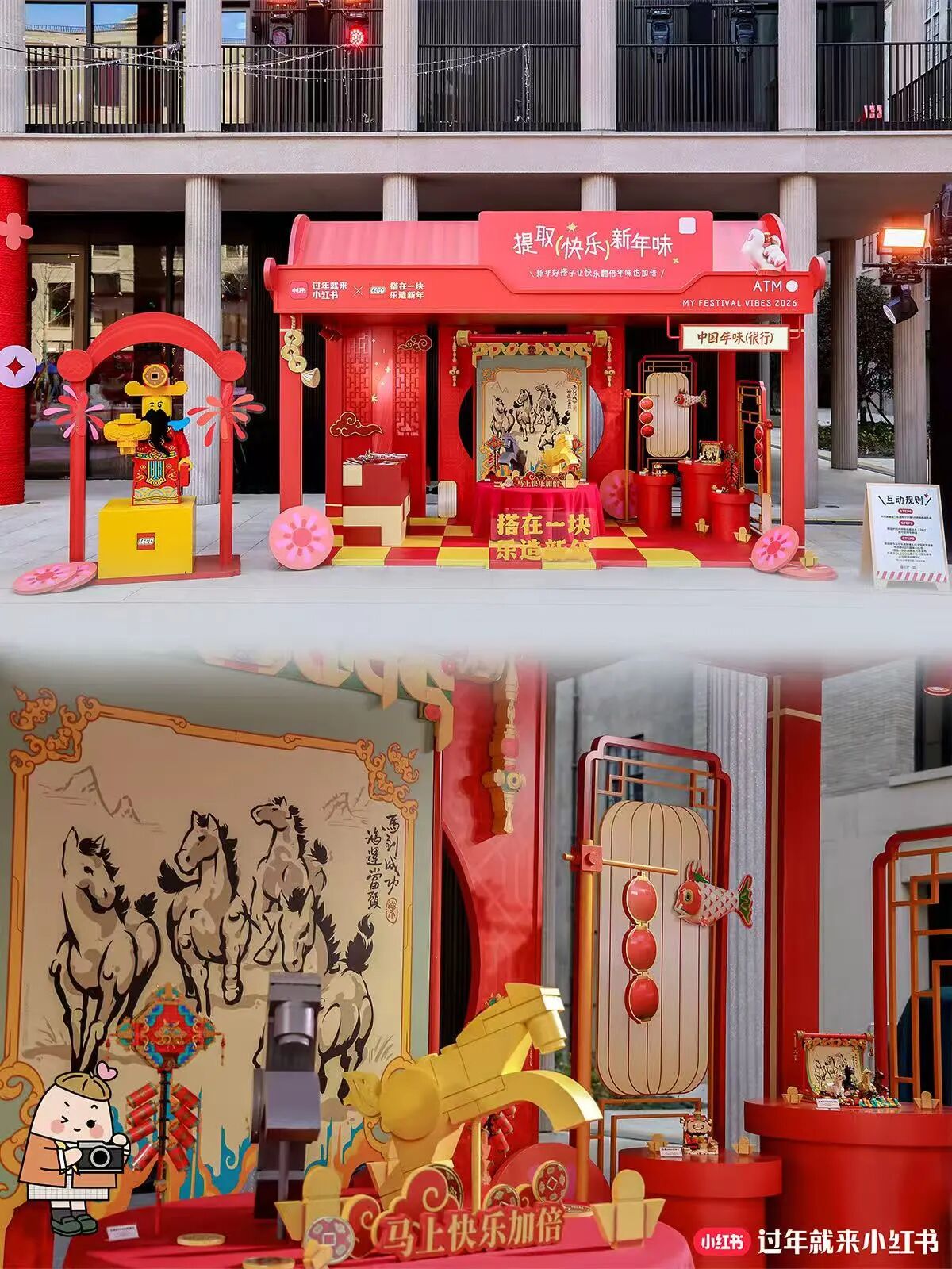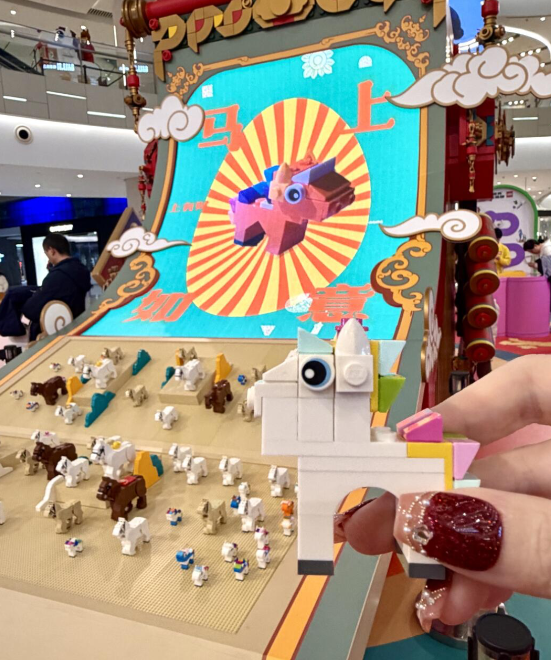 现场四大主题区域,均围绕“拼搭+互动挑战”展开。例如,“马上有好事”,就用谐音梗捕捉了中国人春节“讨彩头”的心理,并将其游戏化——让用户亲手拼搭一匹小马,扫描后可在大屏上看到自己拼搭的小马和新年元素、祝福语一同奔驰。