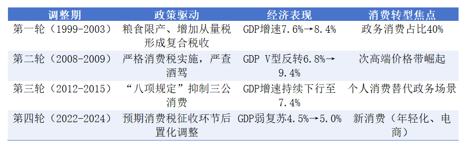 据和君咨询报告,自1999年以来,白酒行业共经历4轮调整周期。鉴于当前行业政务型消费退潮,个人消费占据主流,本轮调整消费转型的焦点落在以年轻化和电商化为主的新消费上。