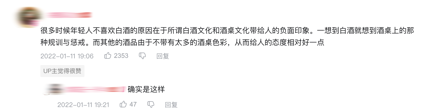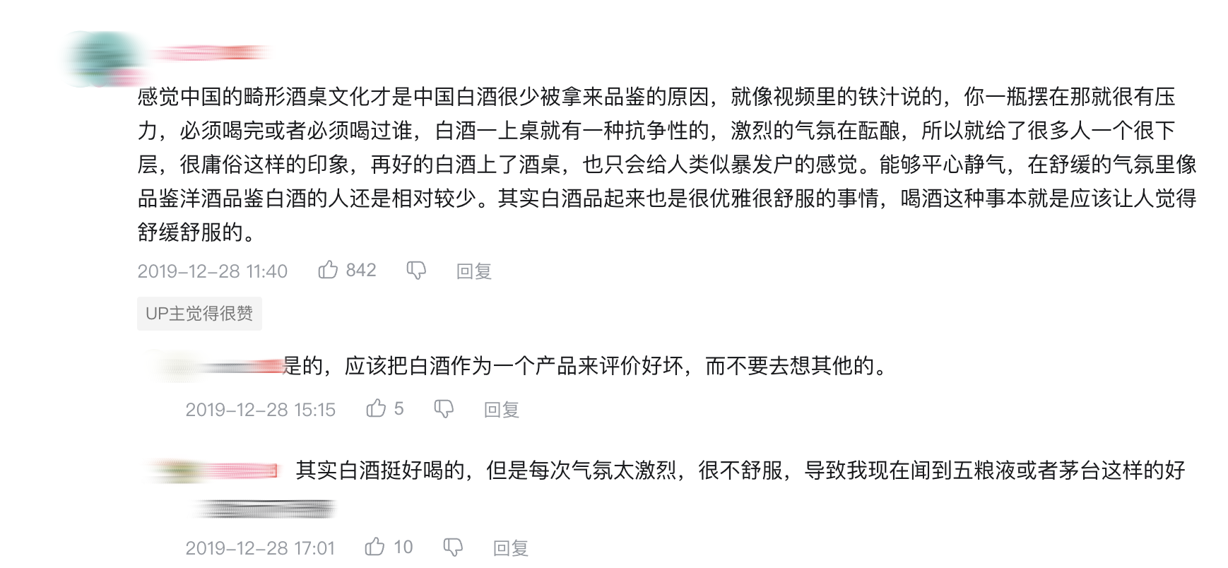 “畸形酒桌文化才是中国白酒很少被拿来品鉴的原因,”有用户在哔哩哔哩分享,“一瓶摆在那就很有压力,必须喝完或者必须喝过谁,白酒一上桌就有一种抗争性的、激烈的气氛在酝酿……”