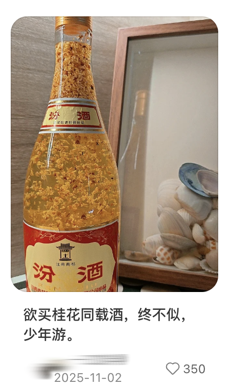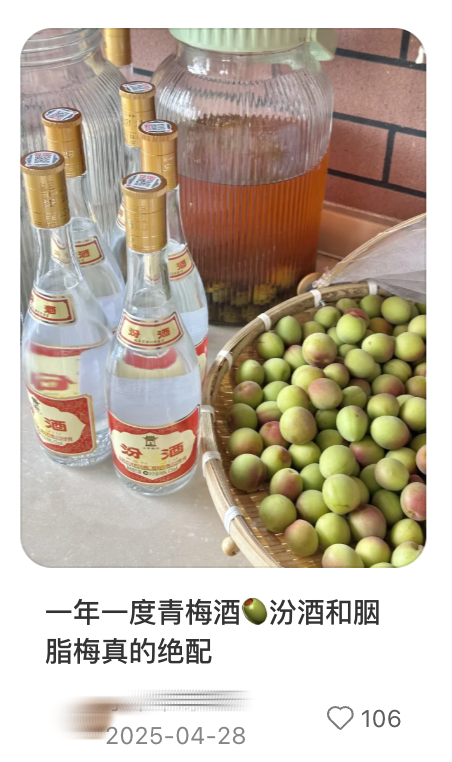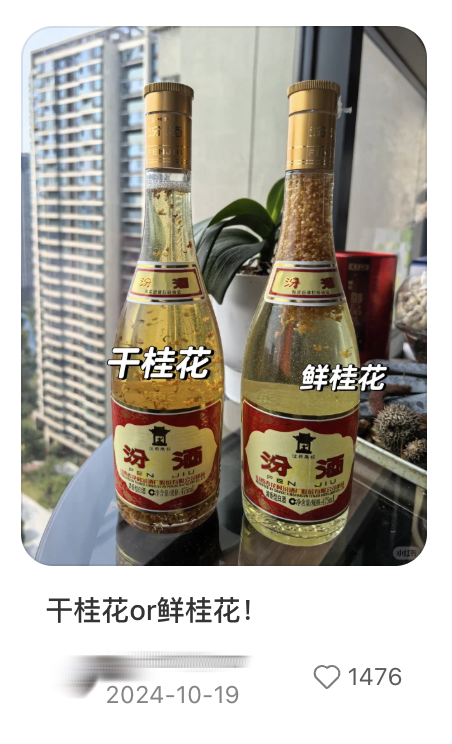 在小红书上,自制桂花汾酒、青梅汾酒出现了“人传人”现象,既有“欲买桂花同载酒”的诗兴,又有DIY、时光沉淀的生活趣味,成为好出片、有谈资的创作素材。有监测数据显示,平价的玻璃汾酒在盒马年销售额突破了15 亿元;55度、950ml的“将军汾”长期占据山姆白酒热度榜的榜首。
