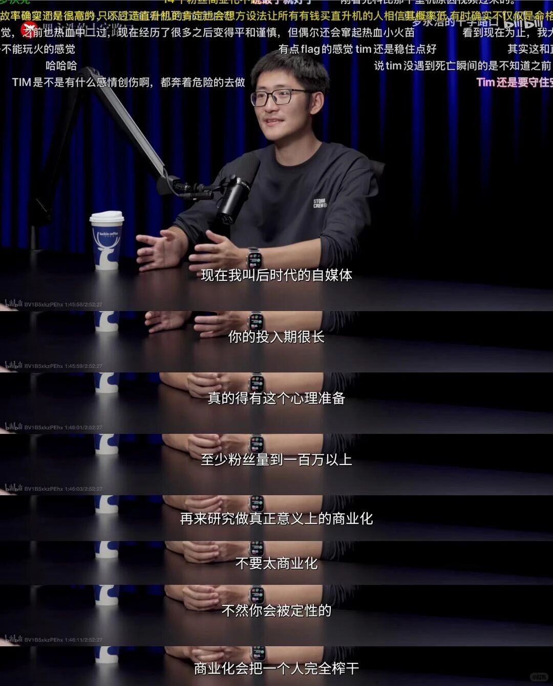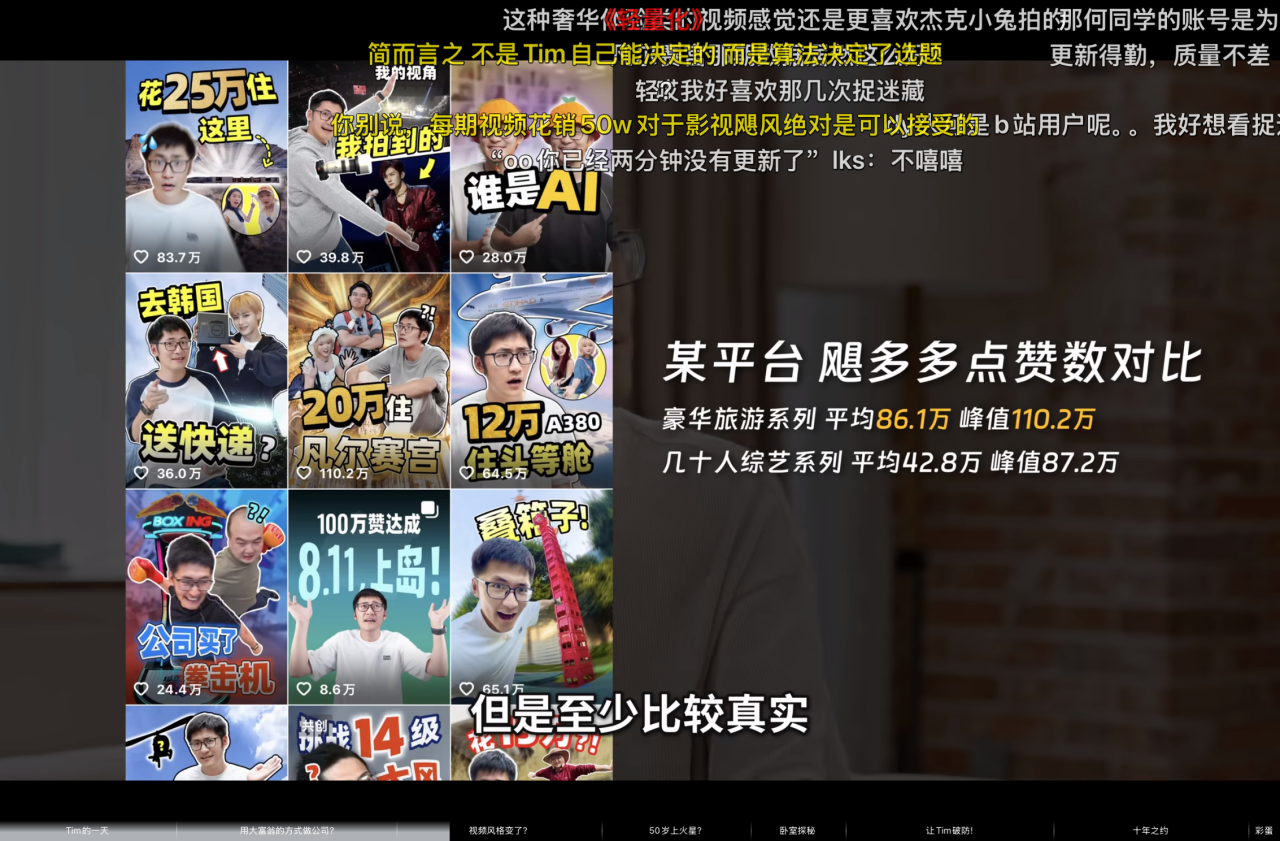 在内容创作者的叙事里,赚钱往往自带一种“背叛感”。这本质上是粉丝对纯粹创作环境的领地保护。当 Tim(潘天鸿)毫不避讳地展示商业野心时,他实际上是在挑战一种潜规则:创作者应该“穷而美”,而非“富而强”。