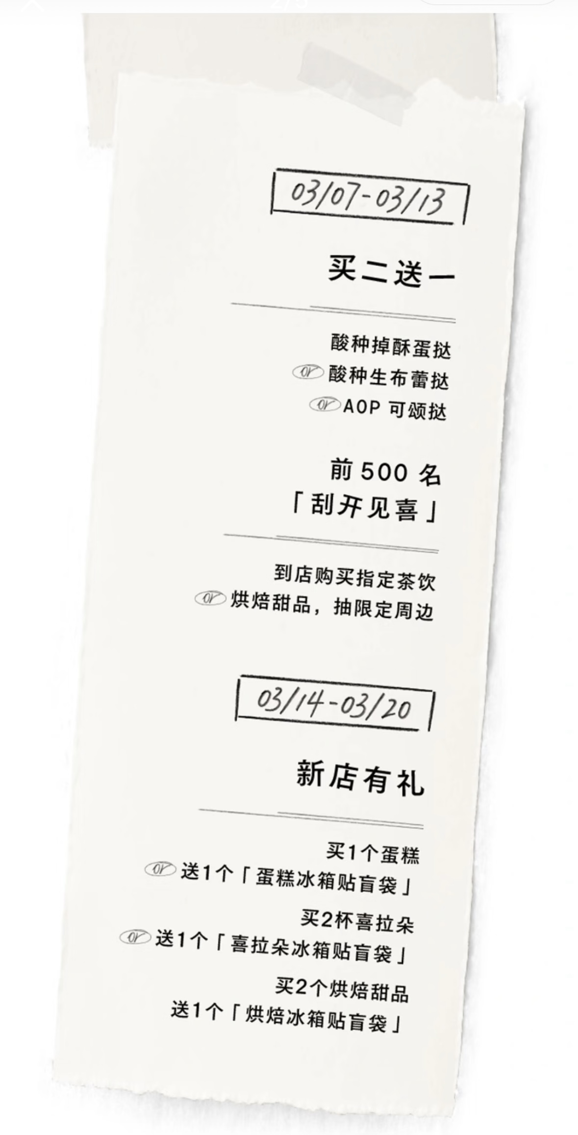 随着2月28日开业,接下来的一周内,该门店,茶饮、蛋糕、烘焙都是买一送一,蛋挞买二送一,买蛋糕送周边等。