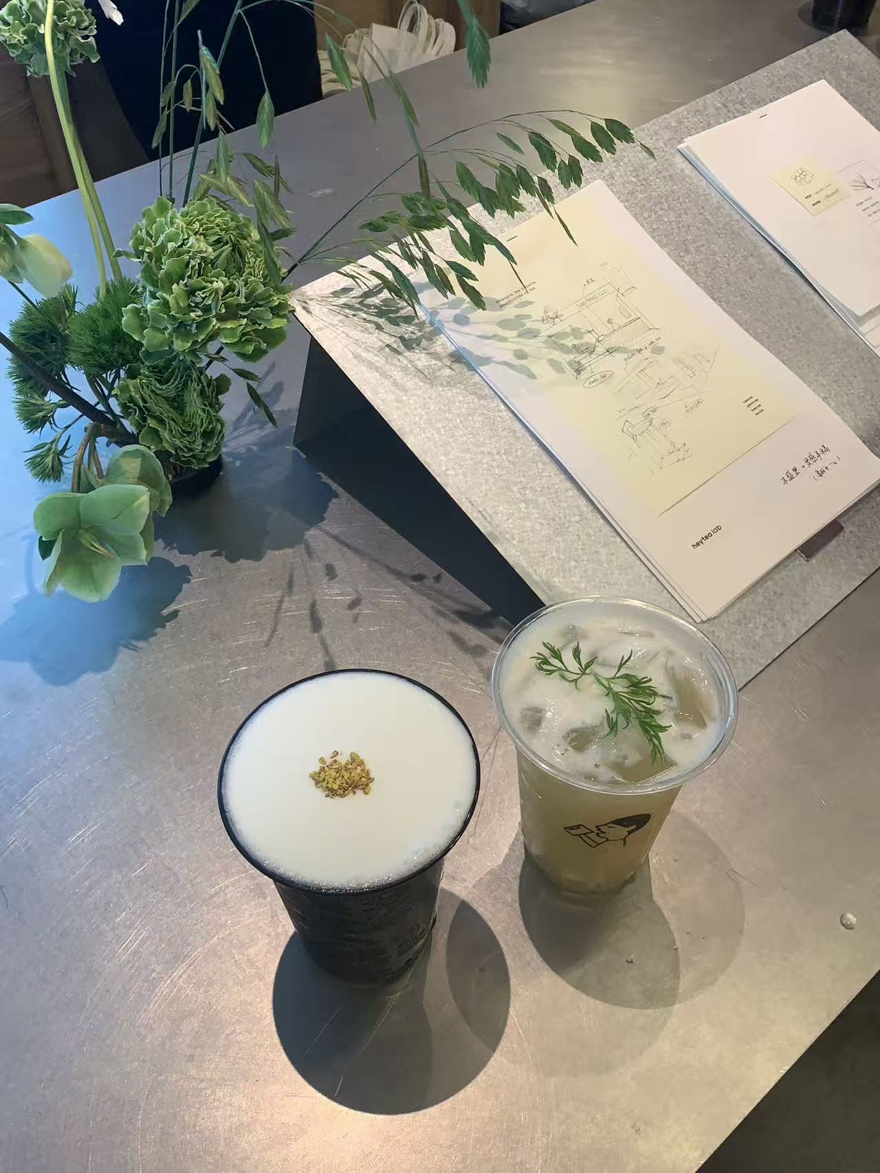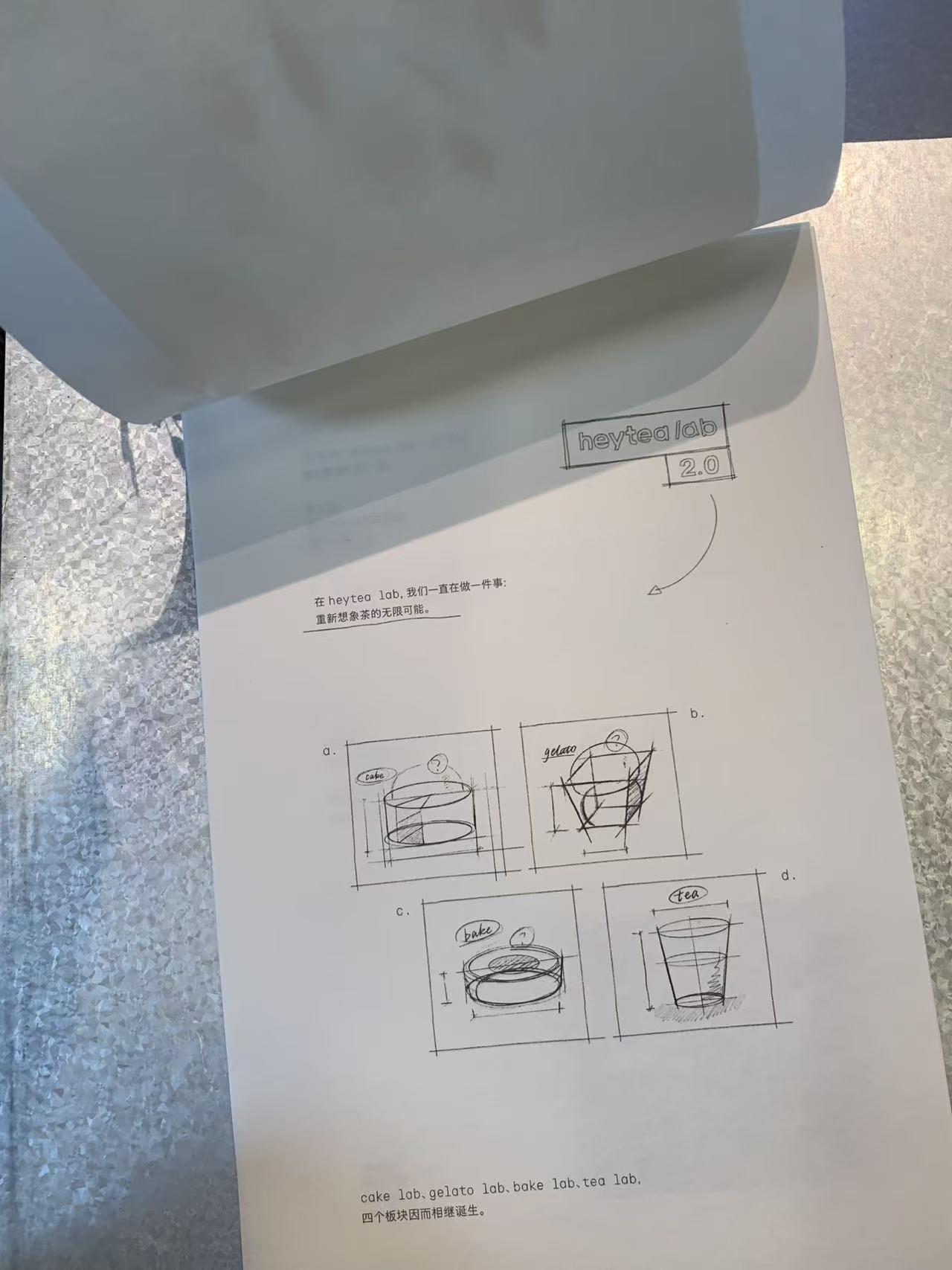 喜茶lab店的装修非常工业、简约,店内多处手稿陈列