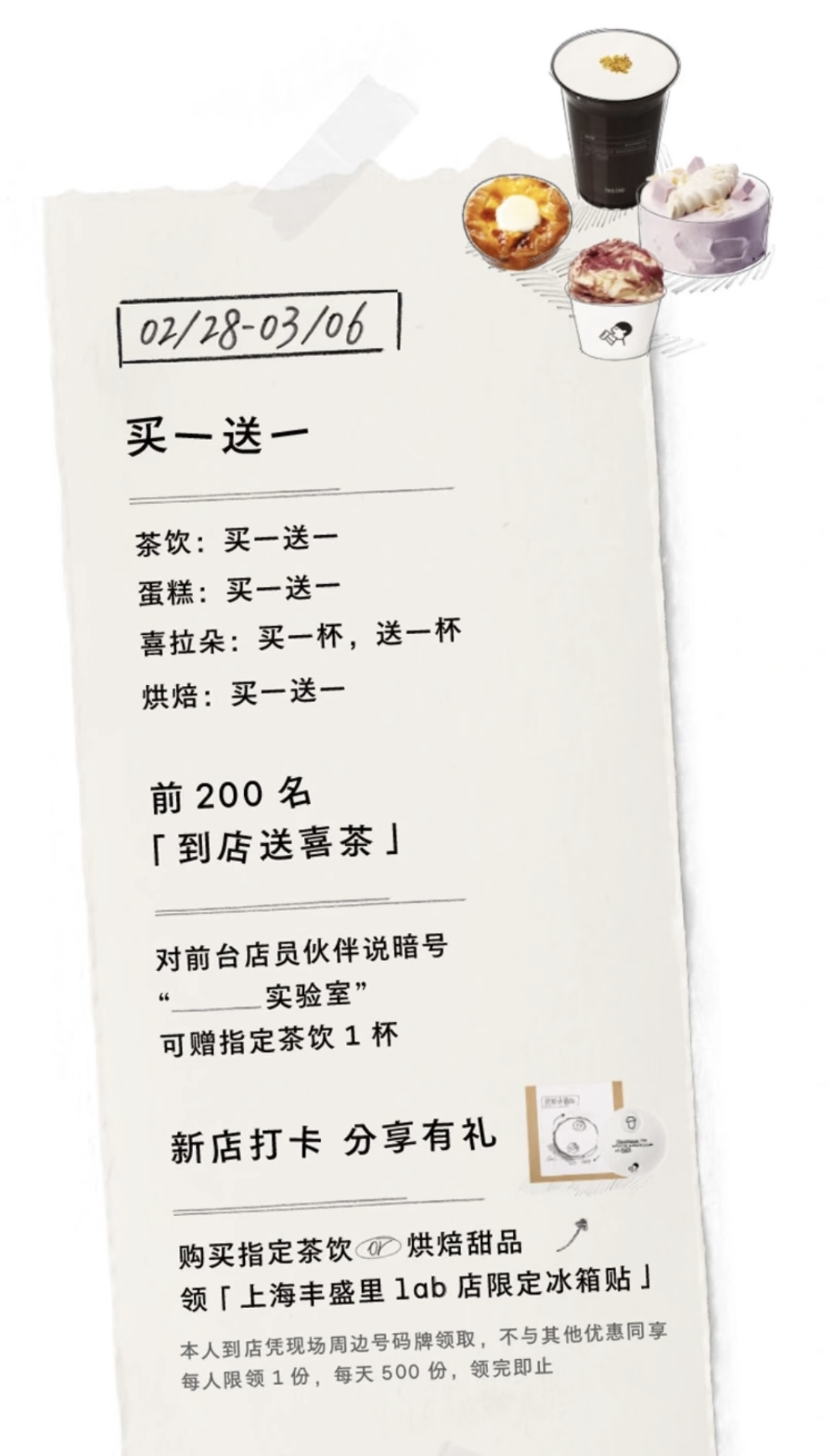 前200名到店的顾客,只要说一句暗号“xxx实验室”,就能免费领一杯茶,打卡还能拿限定周边——购买指定茶饮或者烘焙甜品,可以领上海丰盛里lab店限定冰箱贴。