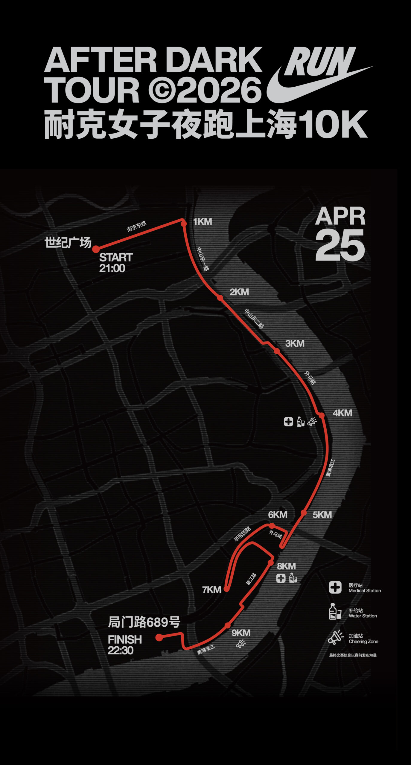 3月13日中午12点开放报名,至3月20日中午12点截止。报名通道开启后,可前往 Nike 耐克微信小程序,进入【耐克女子夜跑上海站】专题页。一站式掌握最新赛事动态,及时获取报名、中签、备赛等最新消息。另外还有 After Dark Tour 跑者故事、专业训练干货、门店活动、赛事直播等你抢先体验。