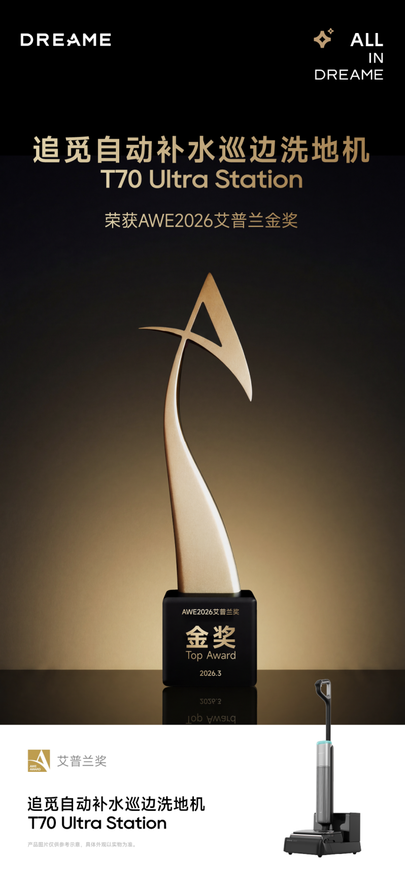 在本届AWE 2026展会期间,追觅T70 Ultra Station获得了家电界最高荣誉–艾普兰奖金奖,也是本届展会唯一一个获得艾普兰金奖的洗地机品牌,以创新实力再次展现了品牌在洗地机领域的领先实力。