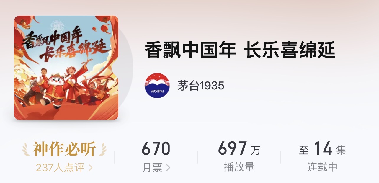 2025年春节,茅台抓住“春运自驾场景”,在喜马拉雅开展整合营销,通过线上线下联动的创意场景化传播,整体曝光超过4.2亿次,线下活动参与人数超2600人,补足了茅台春运营销全版图。
