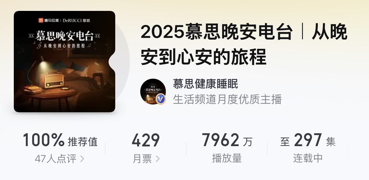 慕思晚安电台是喜马拉雅为慕思打造一档助眠节目,在2024年用温暖声音守护夜晚的基础上,2025年的慕思晚安电台,实现了AIGC进化,打造出“日更的对话式短音频”。