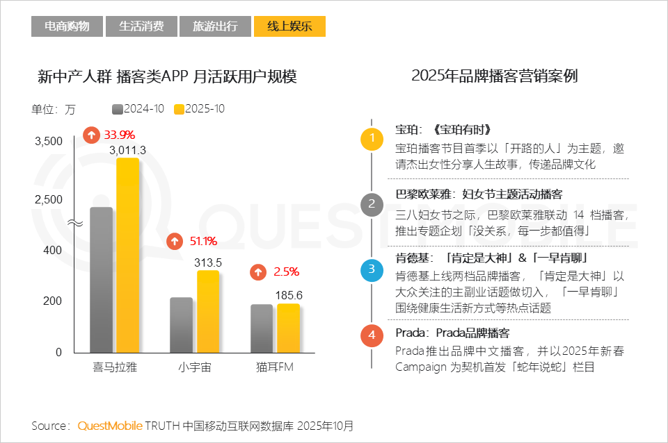 QuestMobile《2025新中产人群洞察报告》显示,喜马拉雅31岁以上用户浓度超越全网,以社会中坚派、资深员工、管理者等为代表的新中产人群规模位列播客类APP首位。这意味着,品牌可以在高净值用户不设防的时刻,建立认同、沉淀好感。