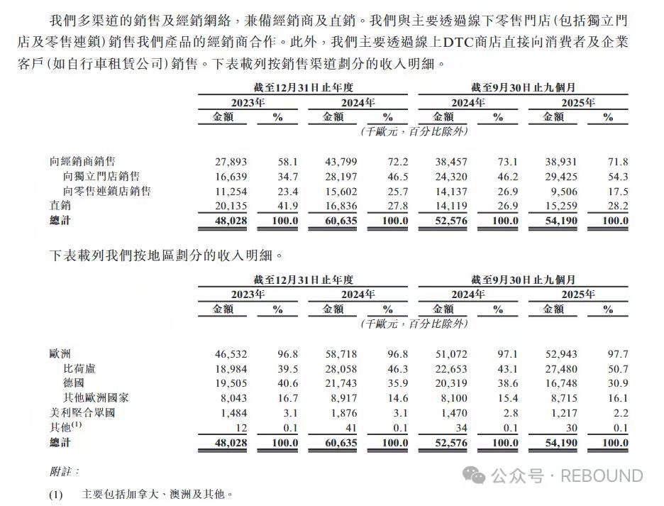 据 Cision Media Share of Voice 的数据,2025年前三季度,TENWAYS 社媒提及量在欧洲电助力自行车品牌中位居第二。招股书也显示,欧洲市场目前是 TENWAYS 的核心营收阵地,2023年、2024年及 2025年前三季度,其来自欧洲地区的收入占总营收的比例分别为 96.8%、96.8%和 97.7%,其中比荷卢地区(比利时、荷兰、卢森堡)是最大收入来源,占整体收入超过一半。TENWAYS 的闪电崛起令人侧目。