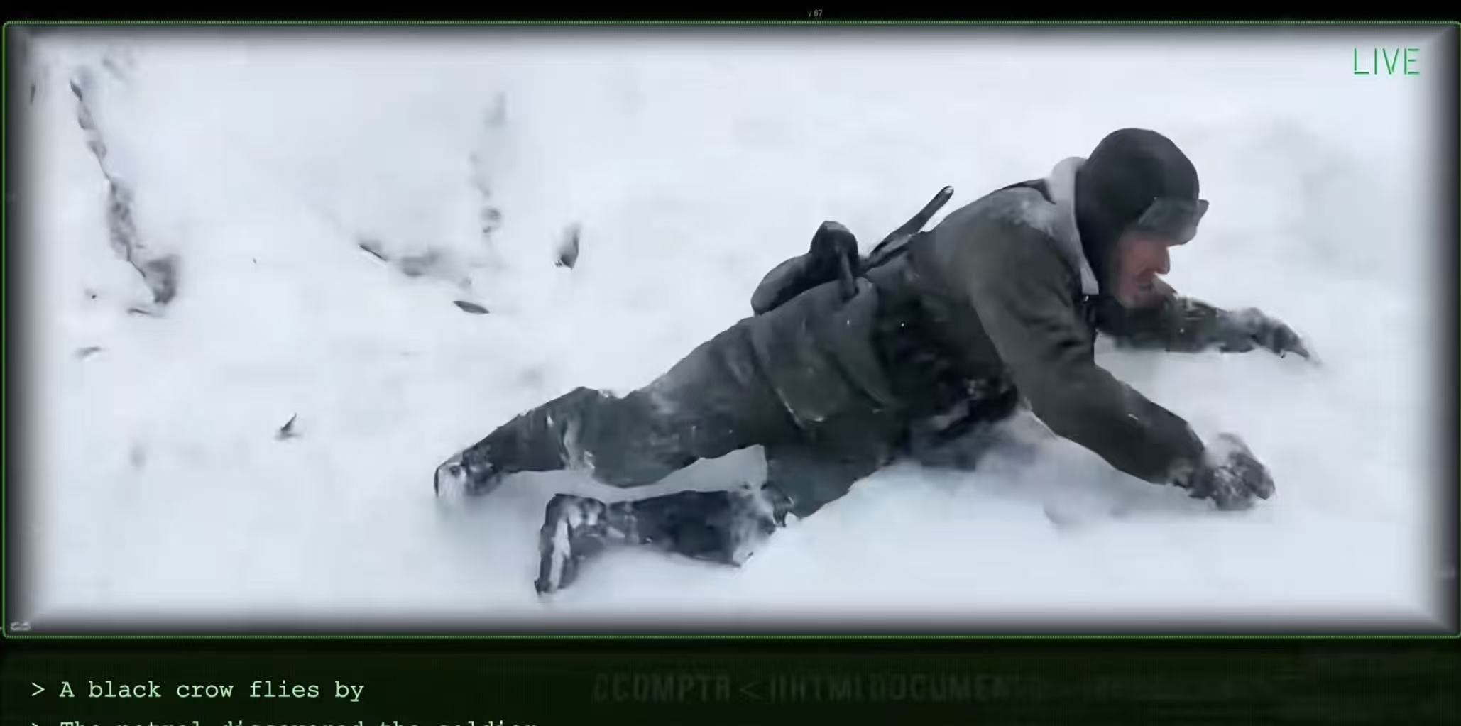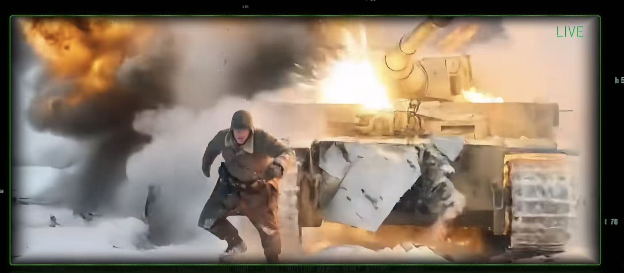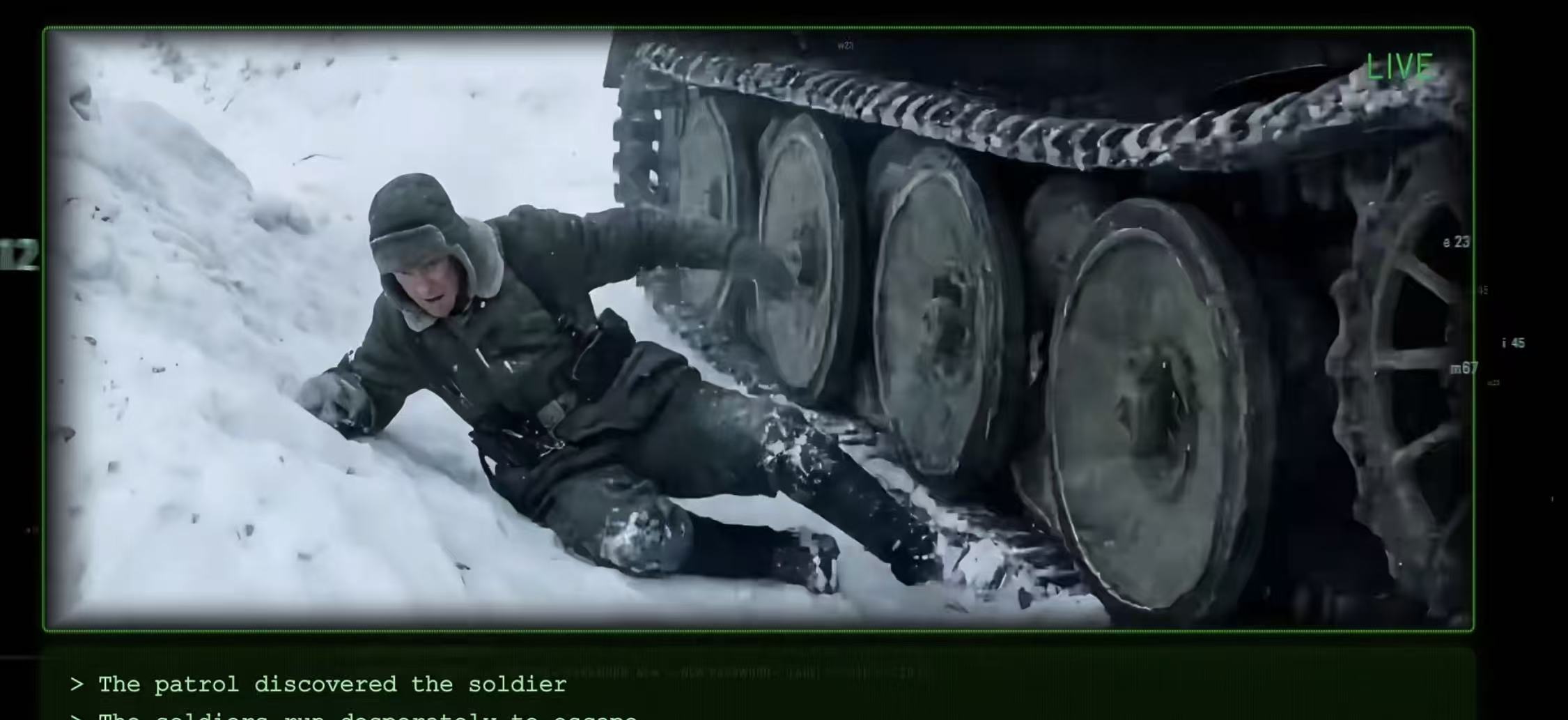 图说/博主“瑞哥那”展示PixVerse R1的瞬时响应技术,视频内容是一个士兵不慎摔倒在雪地上,滑落到坦克旁边,随后坦克爆炸