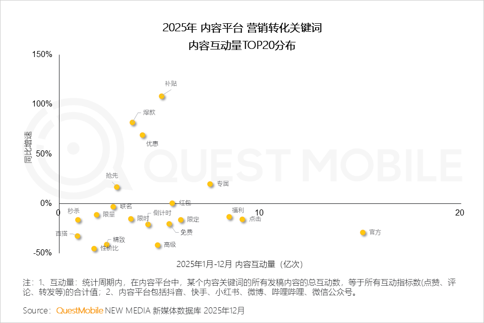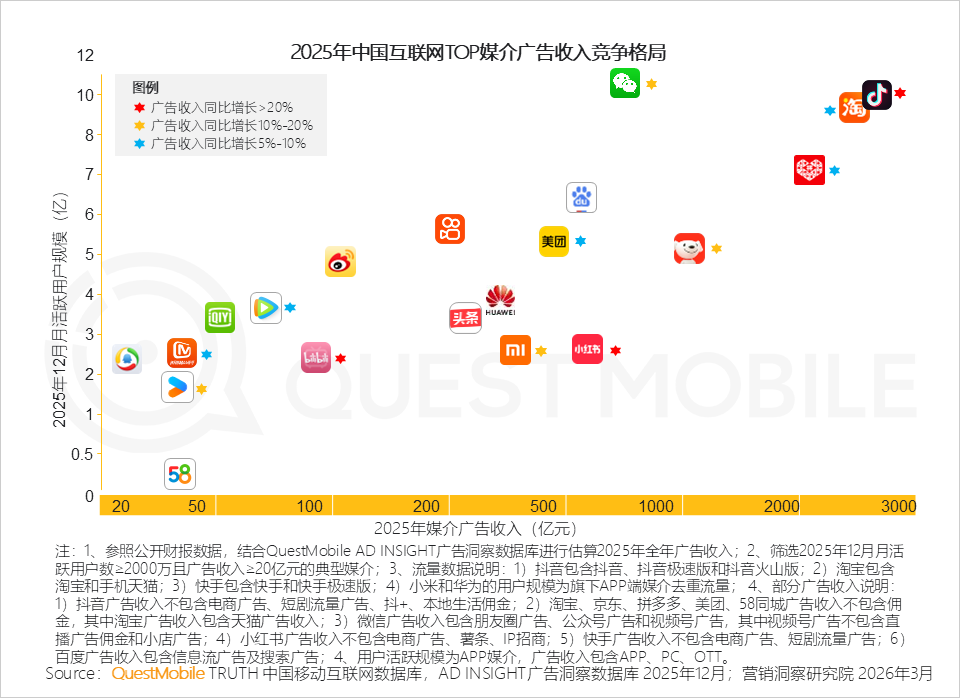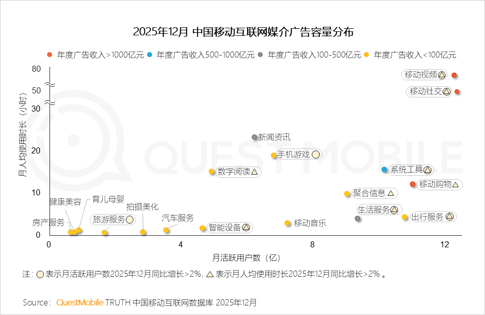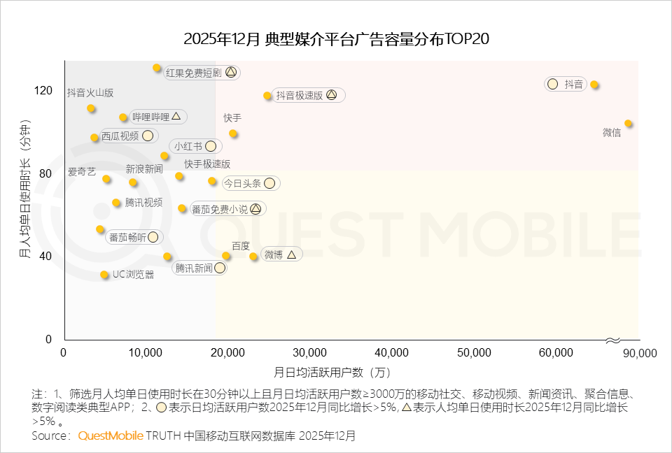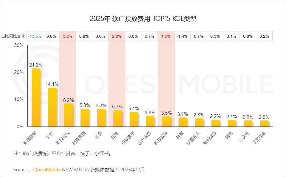 QuestMobile数据显示,2025年,抖音平台中,广告主将更多预算投放至影视娱乐、生活、科技数码等达人;小红书平台中,广告主投放结构变化不大。