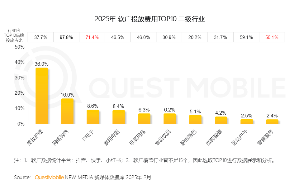 从硬广投放费用占比看,美妆护理行业持续断层式领先;综合行业内TOP10品牌集中度看,传统行业呈现大体量、低集中度的投放特征,中小及新锐品牌仍拥有活跃与突围空间;而互联网行业则表现出极高的集中态势,头部效应显著。